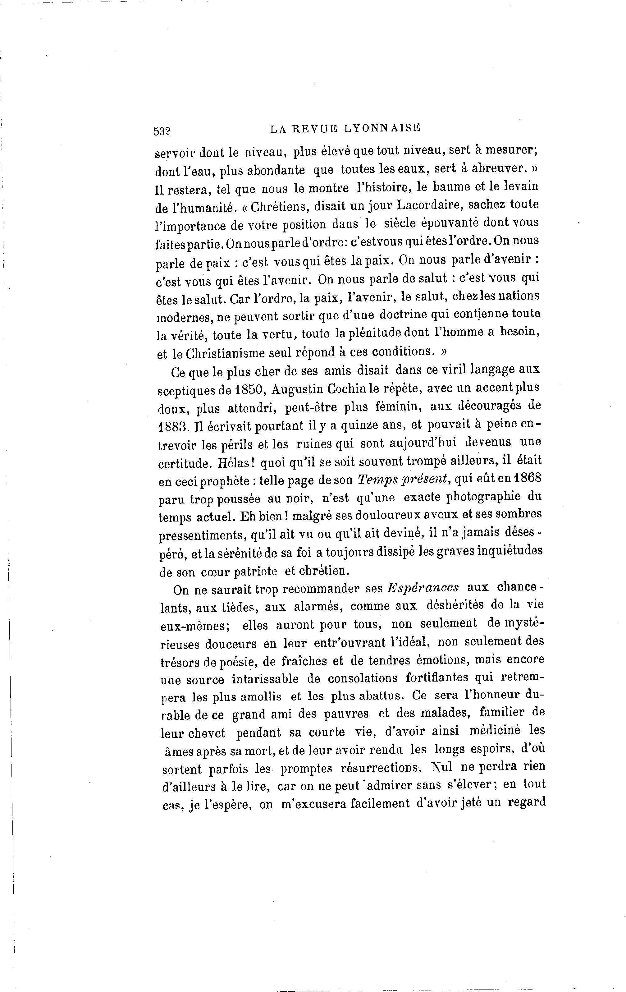 533 LA REVUE LYONNAISE servoir dont le niveau, plus élevé que tout niveau, sert à mesurer; dont l'eau, plus abondante que toutes les eaux, sert à abreuver. » Il restera, tel que nous le montre l'histoire, le baume et le levain de l'humanité. «Chrétiens, disait un jour Lacordaire, sachez toute l'importance de votre position dans le siècle épouvanté dont vous faites partie. On nous parle d'ordre: c'estvous qui êtes l'ordre. On nous parle de paix : c'est vous qui êtes la paix. On nous parle d'avenir : c'est vous qui êtes l'avenir. On nous parle de salut : c'est vous qui êtes le salut. Car l'ordre, la paix, l'avenir, le salut, chez les nations modernes, ne peuvent sortir que d'une doctrine qui contienne toute la vérité, toute la vertu, toute la plénitude dont l'homme a besoin, et le Christianisme seul répond à ces conditions. » Ce que le plus cher de ses amis disait dans ce viril langage aux sceptiques de 1850, Augustin Cochinle répète, avec un accentplus doux, plus attendri, peut-être plus féminin, aux découragés de 1883. Il écrivait pourtant il y a quinze ans, et pouvait à peine en- trevoir les périls et les ruines qui sont aujourd'hui devenus une certitude. Hélas! quoi qu'il se soit souvent trompé ailleurs, il était en ceci prophète : telle page de son Temps présent, qui eût en 1868 paru trop poussée au noir, n'est qu'une exacte photographie du temps actuel. Eh bien ! malgré ses douloureux aveux et ses sombres pressentiments, qu'il ait vu ou qu'il ait deviné, il n'a jamais déses- péré, et la sérénité de sa foi a toujours dissipé les graves inquiétudes de son cœur patriote et chrétien. On ne saurait trop recommander ses Espérances aux chance - lants, aux tièdes, aux alarmés, comme aux déshérités de la vie eux-mêmes; elles auront pour tous, non seulement de mysté- rieuses douceurs en leur entr'ouvrant l'idéal, non seulement des trésors de poésie, de fraîches et de tendres émotions, mais encore une source intarissable de consolations fortifiantes qui retrem- pera les plus amollis et les plus abattus. Ce sera l'honneur du- rable de ce grand ami des pauvres et des malades, familier de leur chevet pendant sa courte vie, d'avoir ainsi médiciné les âmes après sa mort, et de leur avoir rendu les longs espoirs, d'où sortent parfois les promptes résurrections. Nul ne perdra rien d'ailleurs à le lire, car on ne peut 'admirer sans s'élever; en tout cas, je l'espère, on m'excusera facilement d'avoir jeté un regard