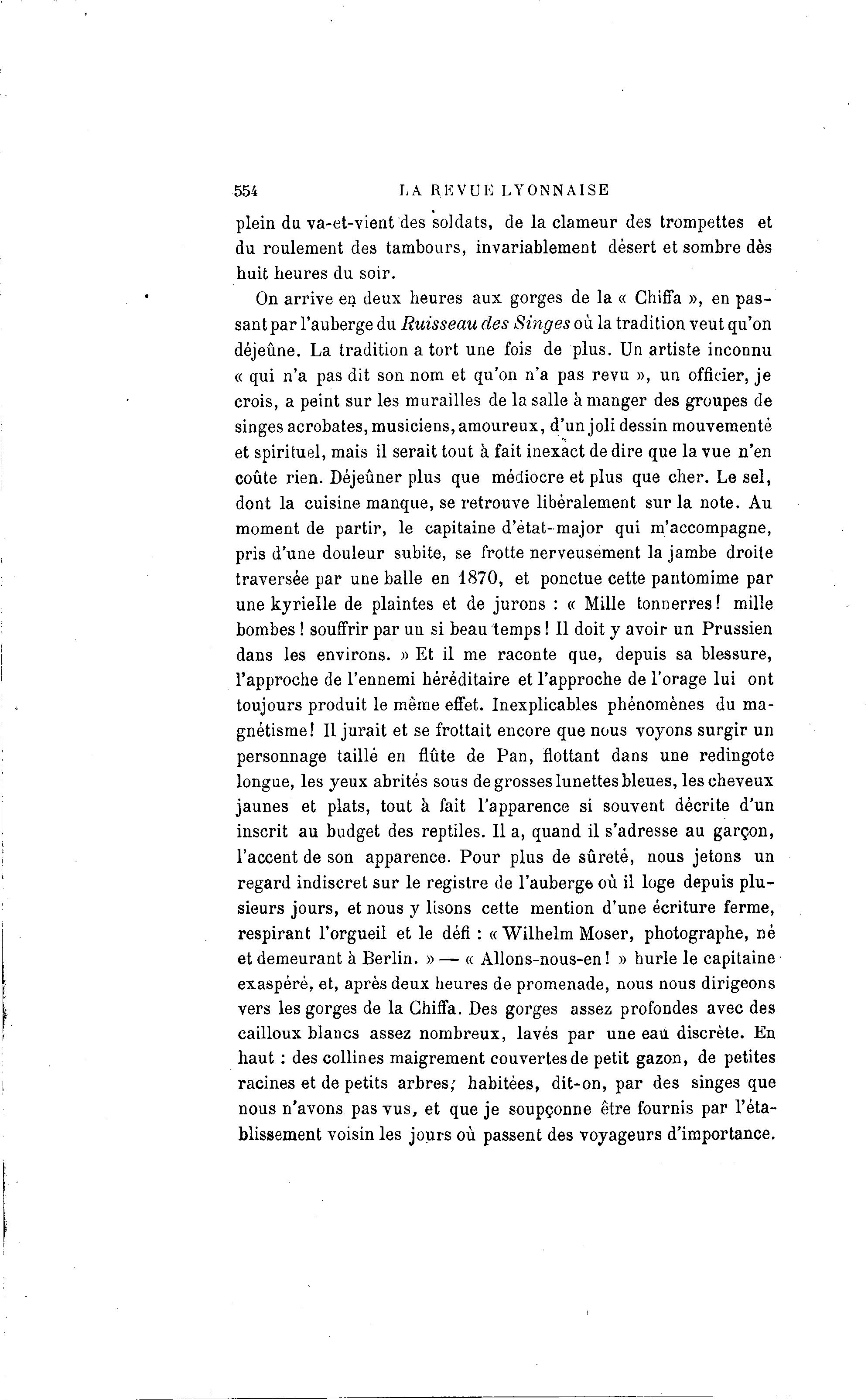 554 LA RKVUK LYONNAISE plein du va-et-vient des soldats, de la clameur des trompettes et du roulement des tambours, invariablement désert et sombre dès huit heures du soir. On arrive en deux heures aux gorges de la « Chiffa », en pas- sant par l'auberge du Ruisseau des Singes où la tradition veut qu'on déjeûne. La tradition a tort une fois de plus. Un artiste inconnu « qui n'a pas dit son nom et qu'on n'a pas revu », un officier, je crois, a peint sur les murailles de la salle à manger des groupes de singes acrobates, musiciens, amoureux, d'un joli dessin mouvementé et spirituel, mais il serait tout à fait inexact de dire que la vue n'en coûte rien. Déjeûner plus que médiocre et plus que cher. Le sel, dont la cuisine manque, se retrouve libéralement sur la note. Au moment de partir, le capitaine d'état- major qui m'accompagne, pris d'une douleur subite, se frotte nerveusement la jambe droite traversée par une balle en 1870, et ponctue cette pantomime par une kyrielle de plaintes et de jurons : « Mille tonnerres ! mille bombes ! souffrir par un si beau temps ! Il doit y avoir un Prussien dans les environs. » Et il me raconte que, depuis sa blessure, l'approche de l'ennemi héréditaire et l'approche de l'orage lui ont toujours produit le même effet. Inexplicables phénomènes du ma- gnétisme! Il jurait et se frottait encore que nous voyons surgir un personnage taillé en flûte de Pan, flottant dans une redingote longue, les yeux abrités sous de grosses lunettes bleues, les cheveux jaunes et plats, tout à fait l'apparence si souvent décrite d'un inscrit au budget des reptiles. Il a, quand il s'adresse au garçon, l'accent de son apparence. Pour plus de sûreté, nous jetons un regard indiscret sur le registre de l'auberge où il loge depuis plu- sieurs jours, et nous y lisons cette mention d'une écriture ferme, respirant l'orgueil et le défi : « Wilhelm Moser, photographe, né et demeurant à Berlin. » — « Allons-nous-en! » hurle le capitaine exaspéré, et, après deux heures de promenade, nous nous dirigeons vers les gorges de la Chiffa. Des gorges assez profondes avec des cailloux blancs assez nombreux, lavés par une eau discrète. En haut : des collines maigrement couvertes de petit gazon, de petites racines et de petits arbres; habitées, dit-on, par des singes que nous n'avons pas vus, et que je soupçonne être fournis par l'éta- blissement voisin les jours où passent des voyageurs d'importance.