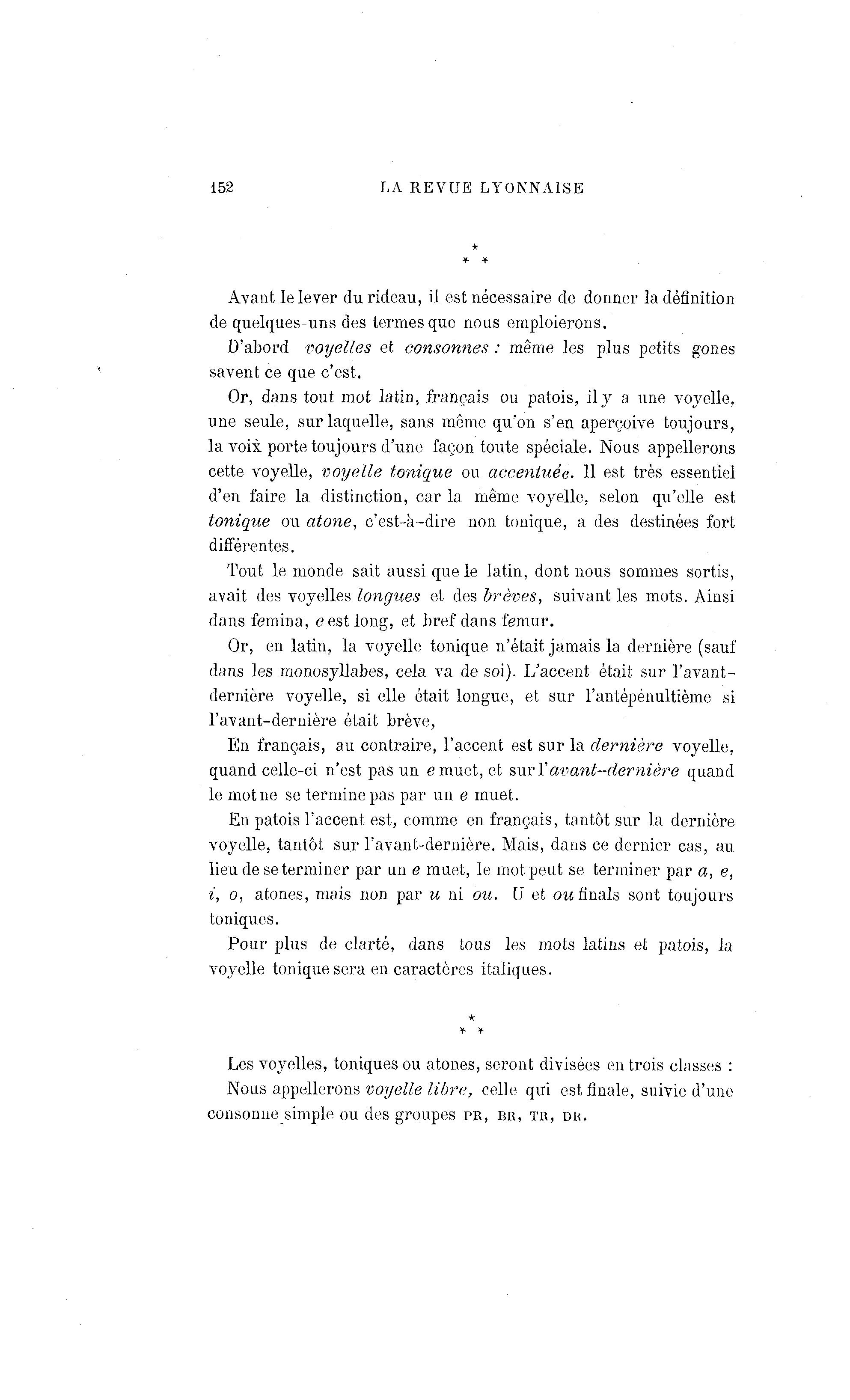 152 LA REVUE LYONNAISE Avant le lever du rideau, il est nécessaire de donner la définition de quelques-uns des termes que nous emploierons. D'abord voyelles et consonnes : même les plus petits gones savent ce que c'est. Or, dans tout mot latin, français ou patois, il y a une voyelle, une seule, sur laquelle, sans même qu'on s'en aperçoive toujours, la voix porte toujours d'une façon toute spéciale. Nous appellerons cette voyelle, voyelle tonique ou accentuée. Il est très essentiel d'en faire la distinction, car la même voyelle, selon qu'elle est tonique ou atone, c'est-à -dire non tonique, a des destinées fort différentes. Tout le monde sait aussi que le latin, dont nous sommes sortis, avait des voyelles longues et des brèves, suivant les mots. Ainsi dans femina,