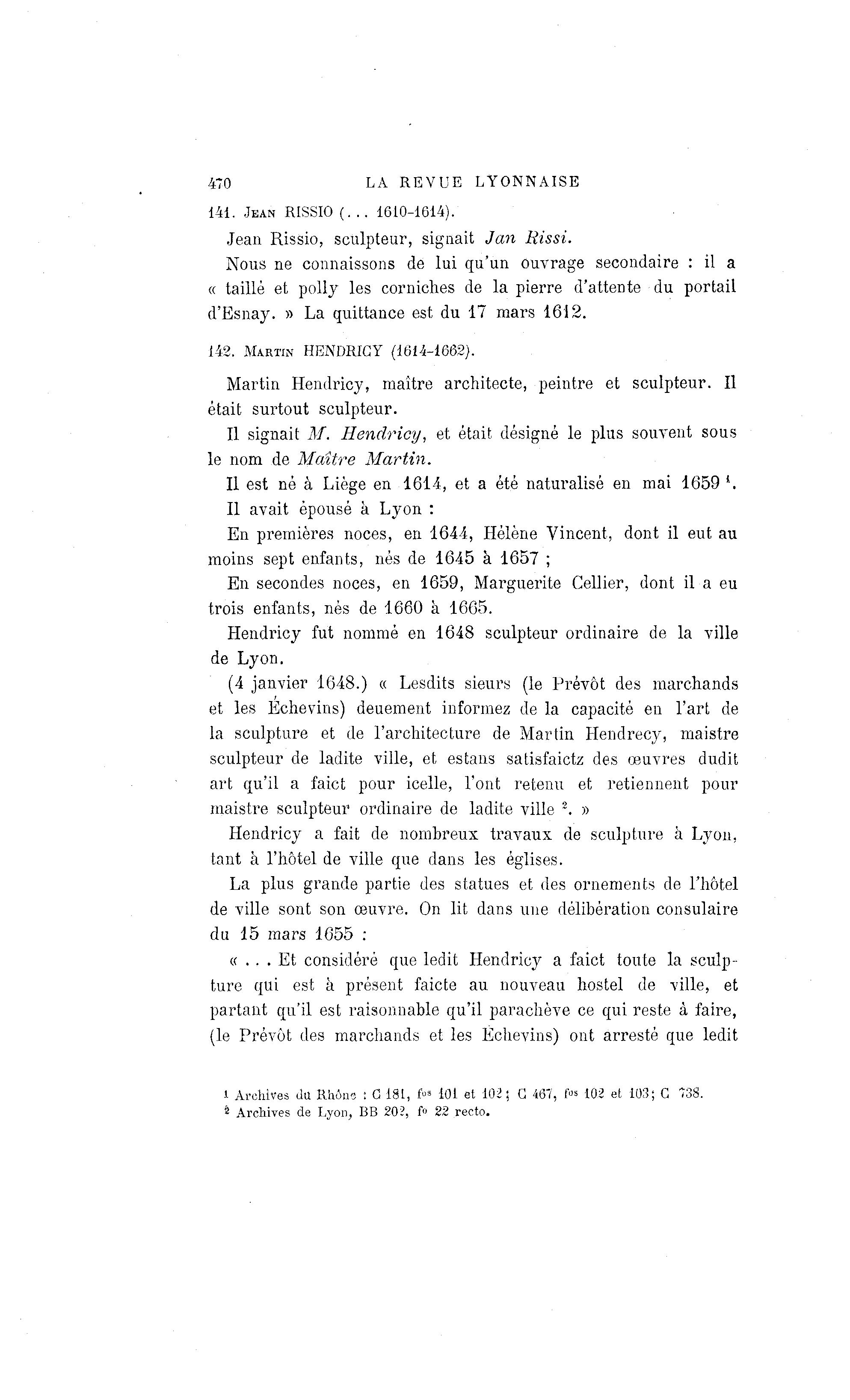 Hendricy a fait de nombreux travaux de sculpture à Lyon,