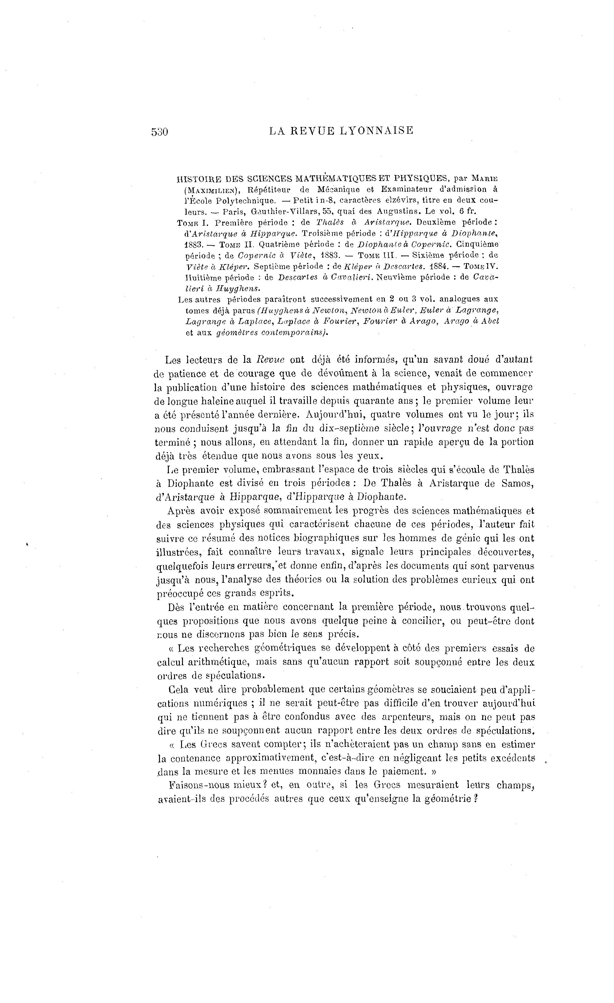 Le premier volume, embrassant l'espace de trois siècles qui s'écoule de Thaïes