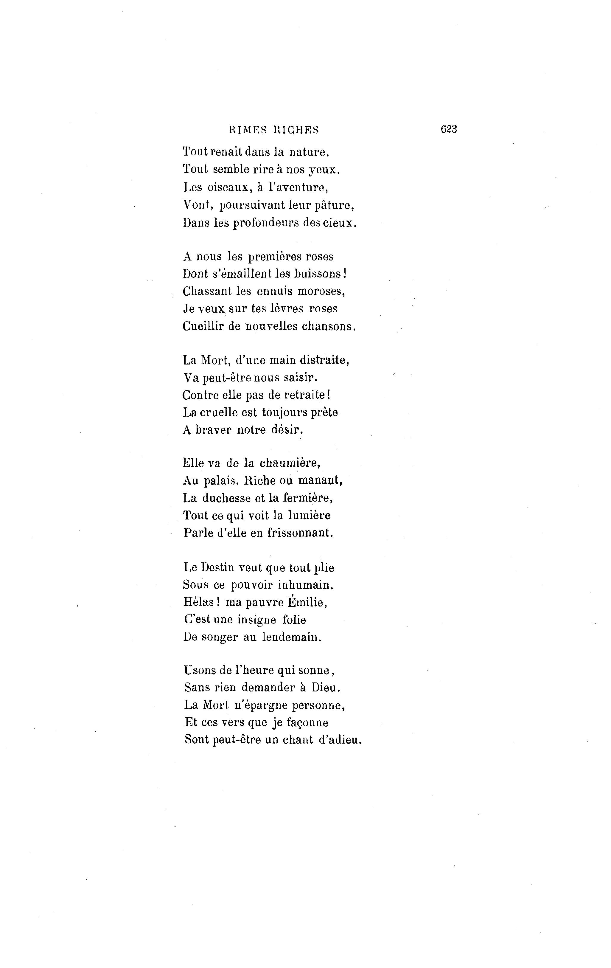 RIMES RICHES 623 Tout renaît dans la nature. Tout semble rire à nos yeux. Les oiseaux, à l'aventure, Vont, poursuivant leur pâture, Dans les profondeurs descieux. A nous les premières roses Dont s'émaillent les buissons! Chassant les ennuis moroses, Je veux sur tes lèvres roses Cueillir de nouvelles chansons. La Mort, d'une main distraite, Va peut-être nous saisir. Contre elle pas de retraite ! La cruelle est toujours prête A braver notre désir. Elle va de la chaumière, Au palais. Riche ou manant, La duchesse et la fermière, Tout ce qui voit la lumière Parle d'elle en frissonnant. Le Destin veut que tout plie Sous ce pouvoir inhumain. Hélas ! ma pauvre Emilie, C'est une insigne folie De songer au lendemain. Usons de l'heure qui sonne, Sans rien demander à Dieu. La Mort n'épargne personne, Et ces vers que je façonne Sont peut-être un chant d'adieu.
