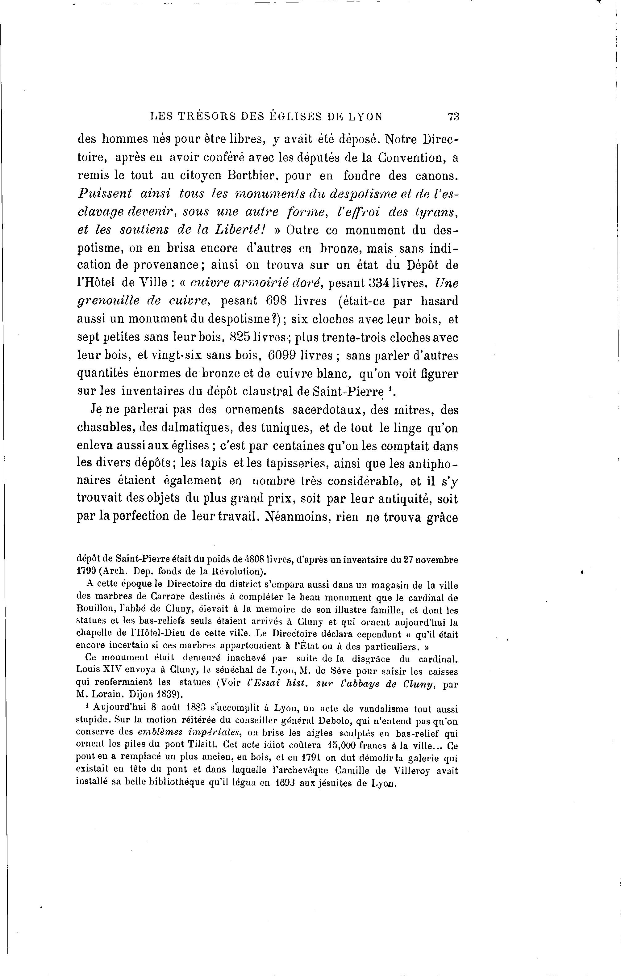 LES TRESORS DES EGLISES DE LYON 73 des hommes nés pour être libres, y avait été déposé. Notre Direc- toire, après en avoir conféré avec les députés de la Convention, a remis le tout au citoyen Berthier, pour en fondre des canons. Puissent ainsi tous les monuments du despotisme et de l'es- clavage devenir, sous une autre forme, l'effroi des tyrans, et les soutiens de la Liberté! » Outre ce monument du des- potisme, on en brisa encore d'autres en bronze, mais sans indi- cation de provenance ; ainsi on trouva sur un état du Dépôt de l'Hôtel de Ville : « cuivre armoiriè doré, pesant 334 livres. Une grenouille de cuivre, pesant 698 livres (était-ce par hasard aussi un monument du despotisme?); six cloches avec leur bois, et sept petites sans leur bois, 825 livres; plus trente-trois cloches avec leur bois, et vingt-six sans bois, 6099 livres ; sans parler d'autres quantités énormes de bronze et de cuivre blanc, qu'on voit figurer sur les inventaires du dépôt claustral de Saint-Pierre '. Je ne parlerai pas des ornements sacerdotaux, des mitres, des chasubles, des dalmatiques, des tuniques, et de tout le linge qu'on enleva aussi aux églises ; c'est par centaines qu'on les comptait dans les divers dépôts; les tapis et les tapisseries, ainsi que les antipho- naires étaient également en nombre très considérable, et il s'y trouvait des objets du plus grand prix, soit par leur antiquité, soit par la perfection de leur travail. Néanmoins, rien ne trouva grâce dépôt de Saint-Pierre était du poids de 4808 livres, d'après un inventaire du 27 novembre 1790 (Arch. Dep. fonds de la Révolution). A cette époque le Directoire du district s'empara aussi dans un magasin de la ville des marbres de Carrare destinés à compléter le beau monument que le cardinal de Bouillon, l'abbé de Cluny, élevait à la mémoire de son illustre famille, et dont les statues et les bas-reliefs seuls étaient arrivés à Cluny et qui ornent aujourd'hui la chapelle de l'Hôtel-Dieu de cette ville. Le Directoire déclara cependant « qu'il était encore incertain si ces marbres appartenaient à l'État ou à des particuliers. » Ce monument était demeuré inachevé par suite de la disgrâce du cardinal. Louis XIV envoya à Cluny, le sénéchal de Lyon, M. de Sève pour saisir les caisses qui renfermaient les statues (Voir l'Essai hist. sur l'abbaye de Cluny, par M. Lorain. Dijon 1839). ' Aujourd'hui 8 août 1883 s'accomplit à Lyon, un acte de vandalisme tout aussi stupide. Sur la motion réitérée du conseiller général Debolo, qui n'entend pas qu'on conserve des emblèmes impériales, on brise les aigles sculptés en bas-relief qui ornent les piles du pont Tilsitt. Cet acte idiot coûtera 15,000 francs à la ville... Ce pont en a remplacé un plus ancien, en bois, et en 1791 on dut démolir la galerie qui existait en tète du pont et dans laquelle l'archevêque Camille de Villeroy avait installé sa belle bibliothèque qu'il légua en 1693 aux jésuites de Lyon.