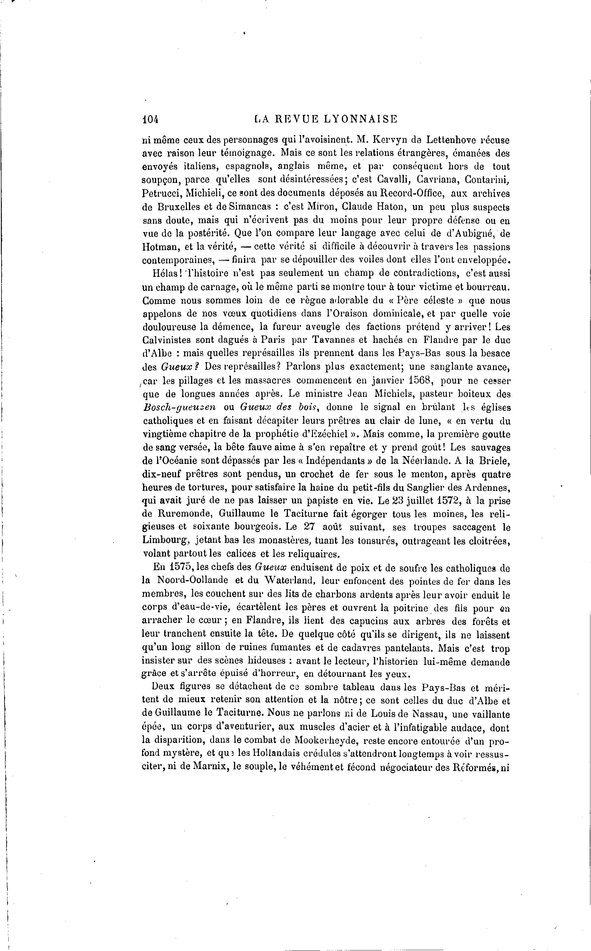 104 LA REVUE LYONNAISE ni même ceux des personnages qui l'avoisinent. M. Kervyn de Lettenhove récuse avec raison leur témoignage. Mais ce sont les relations étrangères, émanées des envoyés italiens, espagnols, anglais même, et par conséquent hors de tout soupçon, parce qu'elles sont désintéressées ; c'est Gavalli, Gavriana, Contarini, Petrucci, Michieli, ce sont des documents déposés au Record-Office, aux archives de Bruxelles et deSimancas : c'est Miron, Claude Haton, un peu plus suspects sans doute, mais qui n'écrivent pas du moins pour leur propre défense ou en vue de la postérité. Que l'on compare leur langage avec celui de d'Aubigné, de Hotman, et la vérité, — cette vérité si difficile à découvrir à travers les passions contemporaines, —finira par se dépouiller des voiles dont elles l'ont enveloppée. Hélas ! l'histoire n'est pas seulement un champ de contradictions, c'est aussi un champ de carnage, où le même parti se montre tour à tour victime et bourreau. Comme nous sommes loin de ce règne adorable du « Père céleste » que nous appelons de nos vœux quotidiens dans l'Oraison dominicale, et par quelle voie douloureuse la démence, la fureur aveugle des factions prétend y arriver ! Les Calvinistes sont dagues à Paris par Tavannes et hachés en Flandre par le duc d'Albe : mais quelles représailles ils prennent dans les Pays-Bas sous la besace des Gueux? Des représailles? Parlons plus exactement; une sanglante avance, car les pillages et les massacres commencent en janvier 1568, pour ne cesser que de longues années après. Le ministre Jean Michiels, pasteur boiteux des Bosch-gueuzen ou Gueux des bois, donne le signal en brûlant les églises catholiques et en faisant décapiter leurs prêtres au clair de lune, « en vertu du vingtième chapitre de la prophétie d'Ezéchiel ». Mais comme, la première goutte de sang versée, la bête fauve aime à s'en repaître et y prend goût! Les sauvages de l'Océanie sont dépassés par les « Indépendants » de la Néerlande. A la Briele, dix-neuf prêtres sont pendus, un crochet de fer sous le menton, après quatre heures de tortures, pour satisfaire la haine du petit-fils du Sanglier des Ardennes, qui avait juré de ne pas laisser un papiste en vie. Le 23 juillet 1572, à la prise de Ruremonde, Guillaume le Taciturne fait égorger tous les moines, les reli- gieuses et soixante bourgeois. Le 27 août suivant, ses troupes saccagent le Limbourg, jetant bas les monastères, tuant les tonsurés, outrageant les cloitrées, volant partout les calices et les reliquaires. Eu 1575, les chefs des Gueux enduisent de poix et de soufre les catholiques de la Noord-Oollande et du Waterland, leur enfoncent des pointes de fer dans les membres, les couchent sur des lits de charbons ardents après leur avoir enduit le corps d'eau-de-vie, écartèlent les pères et ouvrent la poitrine des fils pour en arracher le cœur ; en Flandre, ils lient des capucins aux arbres des forêts et leur tranchent ensuite la tête. De quelque côté qu'ils se dirigent, ils ne laissent qu'un long sillon de ruines fumantes et de cadavres pantelants. Mais c'est trop insister sur des scènes hideuses : avant le lecteur, l'historien lui-même demande grâce et s'arrête épuisé d'horreur, en détournant les yeux. Deux figures se détachent de ce sombre tableau dans les Pays-Bas et méri- tent de mieux retenir son attention et la nôtre ; ce sont celles du duc d'Albe et de Guillaume le Taciturne. Nous ne parlons ni de Louis de Nassau, une vaillante épée, un corps d'aventurier, aux muscles d'acier et à l'infatigable audace, dont la disparition, dans le combat de Mookerheyde, reste encore entourée d'un pro- fond mystère, et quî les Hollandais crédules s'attendront longtemps à voir ressus- citer, ni deMarnix, le souple, le véhément et fécond négociateur des Réformés, ni
