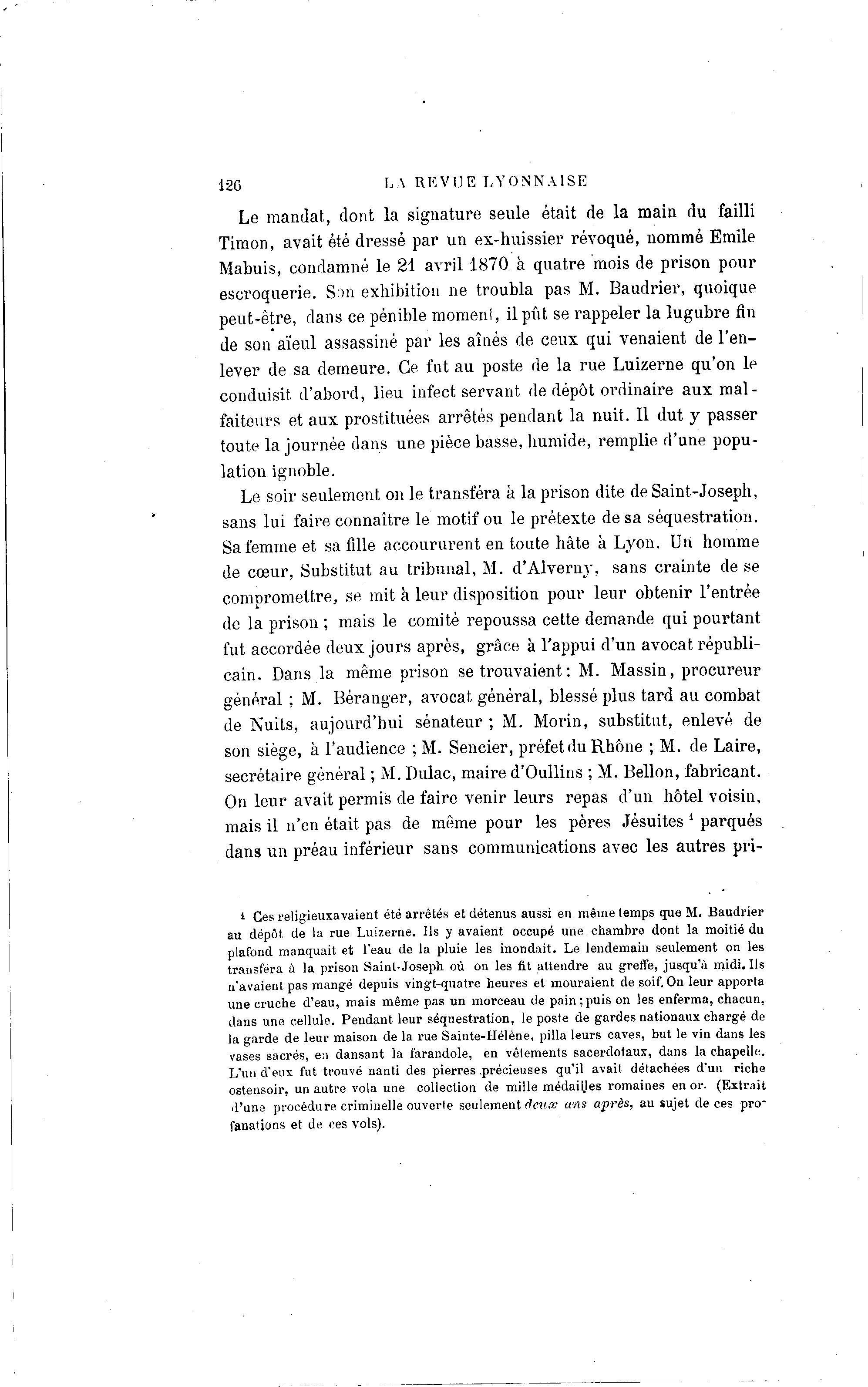 126 LA R E V U E L Y O N N A I S E Le mandat, dont la signature seule était de la main du failli Timon, avait été dressé par un ex-huissier révoqué, nommé Emile Mabuis, condamné le 21 avril 1870 à quatre mois de prison pour escroquerie. Son exhibition ne troubla pas M. Baudrier, quoique peut-être, dans ce pénible moment, il pût se rappeler la lugubre fin de son aïeul assassiné par les aînés de ceux qui venaient de l'en- lever de sa demeure. Ce fut au poste de la rue Luizerne qu'on le conduisit d'abord, lieu infect servant de dépôt ordinaire aux mal- faiteurs et aux prostituées arrêtés pendant la nuit. Il dut y passer toute la journée dans une pièce basse, humide, remplie d'une popu- lation ignoble. Le soir seulement on le transféra à la prison dite de Saint-Joseph, sans lui faire connaître le motif ou le prétexte de sa séquestration. Sa femme et sa fille accoururent en toute hâte à Lyon. Un homme de cœur, Substitut au tribunal, M. d'Alverny, sans crainte de se compromettre, se mit à leur disposition pour leur obtenir l'entrée de la prison ; mais le comité repoussa cette demande qui pourtant fut accordée deux jours après, grâce à l'appui d'un avocat républi- cain. Dans la même prison se trouvaient : M. Massin, procureur général ; M. Béranger, avocat général, blessé plus tard au combat de Nuits, aujourd'hui sénateur ; M. Morin, substitut, enlevé de son siège, à l'audience ; M. Sencier, préfet du Rhône ; M. de Laire, secrétaire général ; M. Dulac, maire d'Oullins ; M. Bellon, fabricant. On leur avait permis de faire venir leurs repas d'un hôtel voisin, mais il n'en était pas de même pour les pères Jésuites i parqués dans un préau inférieur sans communications avec les autres pri- i Ces religieuxavaient été arrêtés et détenus aussi en même temps que M. Baudrier au dépôt de la rue Luizerne. Ils y avaient occupé une chambre dont la moitié du plafond manquait et l'eau de la pluie les mondait. Le lendemain seulement on les transféra à la prison Saint-Joseph où on les fit attendre au greffe, jusqu'à midi. Ils n'avaient pas mangé depuis vingt-quatre heures et mouraient de soif. On leur apporta une cruche d'eau, mais même pas un morceau de pain;puis on les enferma, chacun, dans une cellule. Pendant leur séquestration, le poste de gardes nationaux chargé de la garde de leur maison de la rue Sainte-Hélène, pilla leurs caves, but le vin dans les vases sacrés, en dansant la farandole, en vêlements sacerdotaux, dans la chapelle. L'un d'eux fut, trouvé nanti des pierres .précieuses qu'il avait détachées d'un riche ostensoir, un autre vola une collection de mille médailjes romaines en or. (Extrait d'une procédure criminelle ouverte seulement deux ans après, au sujet de ces pro" fanatjons et de ces vols).