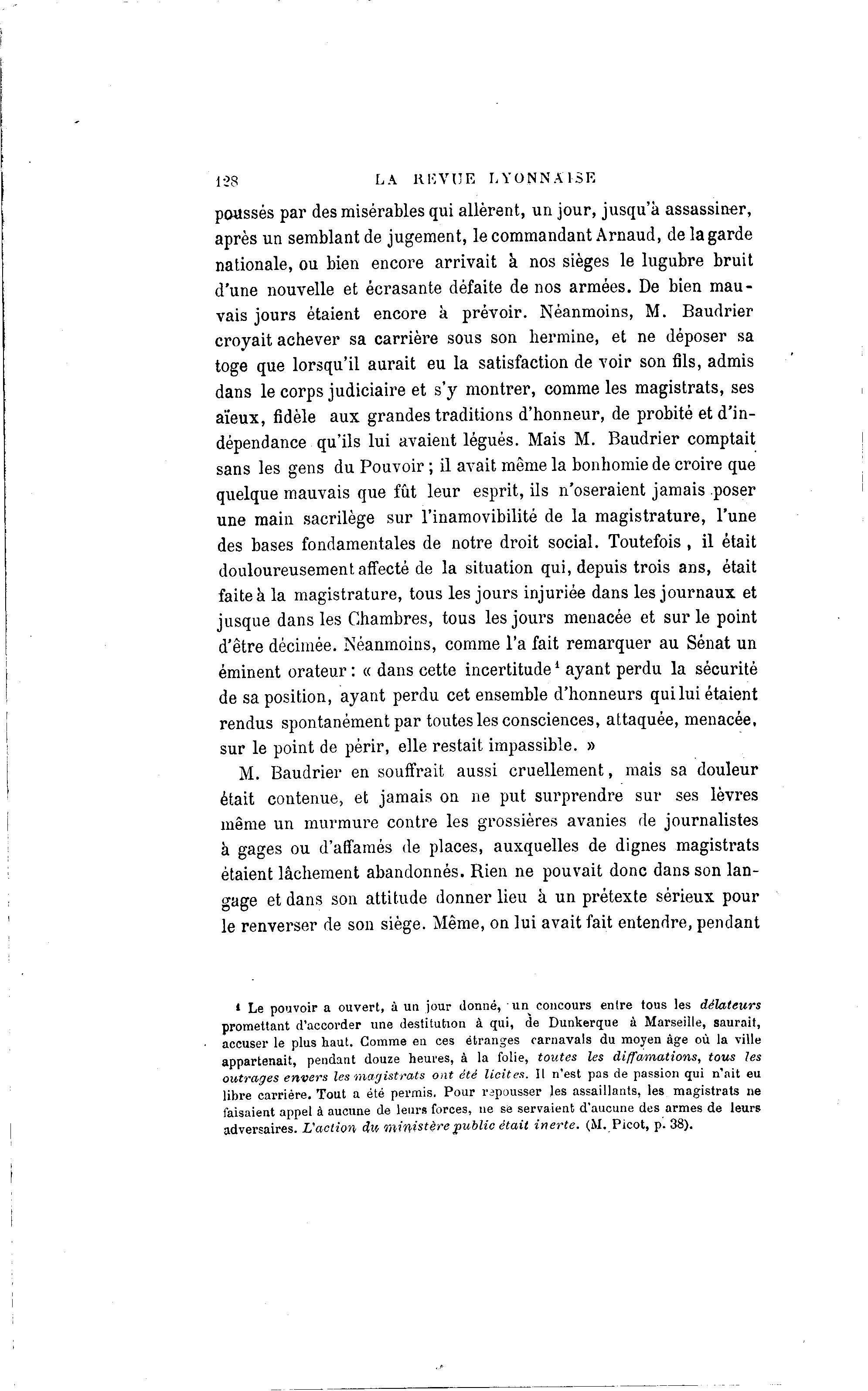 128 LA REVUE LYONNAISE poussés par des misérables qui allèrent, un jour, jusqu'à assassiner, après un semblant de jugement, le commandant Arnaud, de la garde nationale, ou bien encore arrivait à nos sièges le lugubre bruit d'une nouvelle et écrasante défaite de nos armées. De bien mau- vais jours étaient encore à prévoir. Néanmoins, M. Baudrier croyait achever sa carrière sous son hermine, et ne déposer sa toge que lorsqu'il aurait eu la satisfaction de voir son fils, admis dans le corps judiciaire et s'y montrer, comme les magistrats, ses aïeux, fidèle aux grandes traditions d'honneur, de probité et d'in- dépendance qu'ils lui avaient légués. Mais M. Baudrier comptait sans les gens du Pouvoir ; il avait même la bonhomie de croire que quelque mauvais que fût leur esprit, ils n'oseraient jamais poser une main sacrilège sur l'inamovibilité de la magistrature, l'une des bases fondamentales de notre droit social. Toutefois , il était douloureusement affecté de la situation qui, depuis trois ans, était faite à la magistrature, tous les jours injuriée dans les journaux et jusque dans les Chambres, tous les jours menacée et sur le point d'être décimée. Néanmoins, comme l'a fait remarquer au Sénat un êminent orateur : « dans cette incertitude ' ayant perdu la sécurité de sa position, ayant perdu cet ensemble d'honneurs qui lui étaient rendus spontanément par toutes les consciences, attaquée, menacée, sur le point de périr, elle restait impassible. » M. Baudrier en souffrait aussi cruellement, mais sa douleur était contenue, et jamais on ne put surprendre sur ses lèvres même un murmure contre les grossières avanies de journalistes à gages ou d'affamés de places, auxquelles de dignes magistrats étaient lâchement abandonnés. Rien ne pouvait donc dans son lan- gage et dans son attitude donner lieu à un prétexte sérieux pour le renverser de son siège. Même, on lui avait fait entendre, pendant ' Le pouvoir a ouvert, à un jour donné, un concours entre tous les délateurs promettant d'accorder une destitution à qui, de Dunkerque à Marseille, saurait, accuser le plus haut. Comme en ces étranges carnavals du moyen âge où la ville appartenait, pendant douze heures, à la folie, toutes les diffamations, tous les outrages envers les magistrats ont été licites. Il n'est pas de passion qui n'ait eu libre carrière. Tout a été permis. Pour repousser les assaillants, les magistrats ne faisaient appel à aucune de leurs forces, ne se servaient d'aucune des armes de leurs adversaires. L'action du, ministère public était inerte, (il. Picot, p. 38).