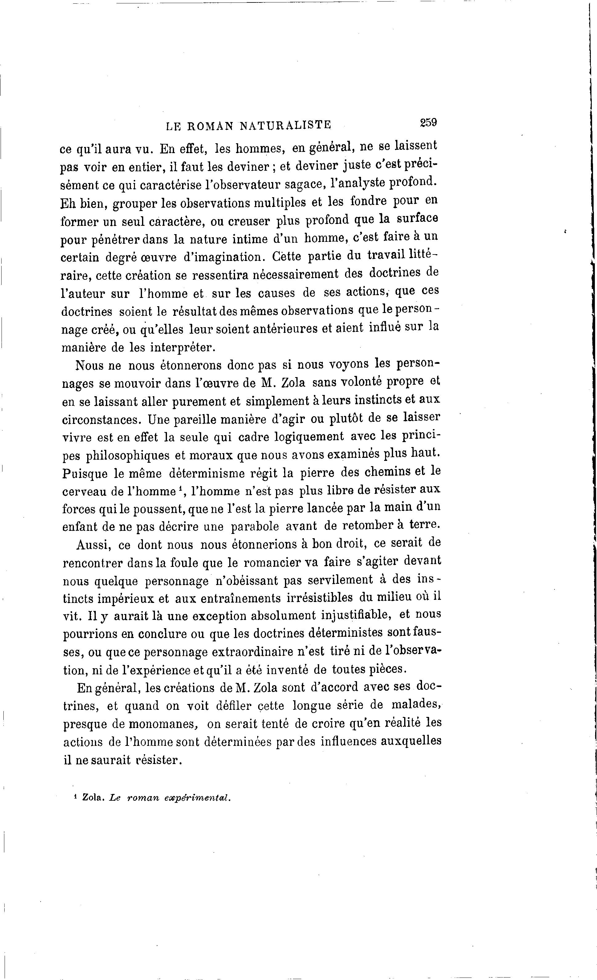 LE ROMAN NATURALISTE 259 ce qu'il aura vu. En effet, les hommes, en général, ne se laissent pas voir en entier, il faut les deviner ; et deviner juste c'est préci- sément ce qui caractérise l'observateur sagace, l'analyste profond. Eh bien, grouper les observations multiples et les fondre pour en former un seul caractère, ou creuser plus profond que la surface pour pénétrer dans la nature intime d'un homme, c'est faire à un certain degré œuvre d'imagination. Cette partie du travail litté- raire, cette création se ressentira nécessairement des doctrines de l'auteur sur l'homme et sur les causes de ses actions, que ces doctrines soient le résultat des mêmes observations que le person- nage créé, ou qu'elles leur soient antérieures et aient influé sur la manière de les interpréter. Nous ne nous étonnerons donc pas si nous voyons les person- nages se mouvoir dans l'œuvre de M. Zola sans volonté propre et en se laissant aller purement et simplement à leurs instincts et aux circonstances. Une pareille manière d'agir ou plutôt de se laisser vivre est en effet la seule qui cadre logiquement avec les princi- pes philosophiques et moraux que nous avons examinés plus haut. Puisque le même déterminisme régit la pierre des chemins et le cerveau de l'homme \ l'homme n'est pas plus libre de résister aux forces qui le poussent, que ne l'est la pierre lancée par la main d'un enfant de ne pas décrire une parabole avant de retomber à terre. Aussi, ce dont nous nous étonnerions à bon droit, ce serait de rencontrer dans la foule que le romancier va faire s'agiter devant nous quelque personnage n'obéissant pas servilement à des ins- tincts impérieux et aux entraînements irrésistibles du milieu où il vit. Il y aurait là une exception absolument injustifiable, et nous pourrions en conclure ou que les doctrines déterministes sont faus- ses, ou que ce personnage extraordinaire n'est tiré ni de l'observa- tion, ni de l'expérience et qu'il a été inventé de toutes pièces. En général, les créations de M. Zola sont d'accord avec ses doc- trines, et quand on voit défiler cette longue série de malades, presque de monomanes, on serait tenté de croire qu'en réalité les actions de l'homme sont déterminées par des influences auxquelles il ne saurait résister. Zola. Le roman expérimental.