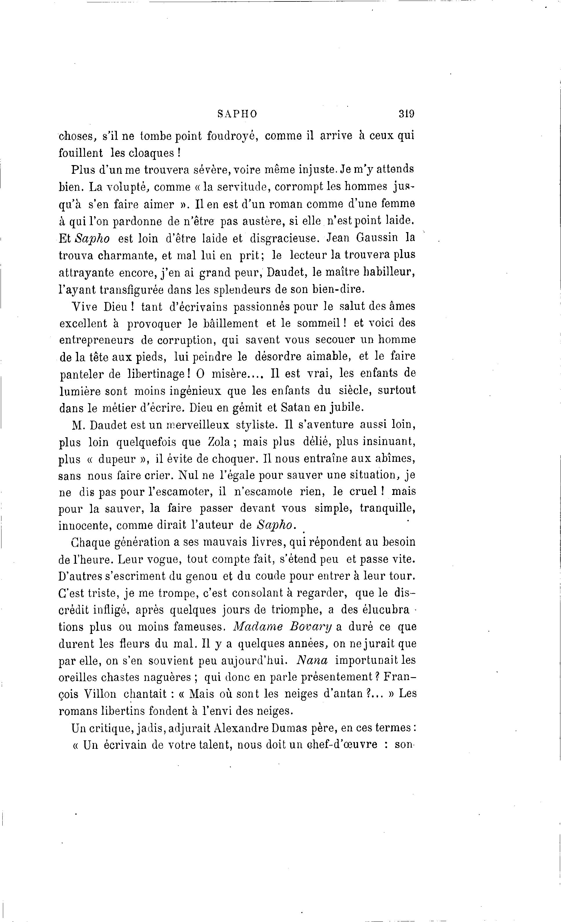 SAPHO 319 choses, s'il ne tombe point foudroyé, comme il arrive à ceux qui fouillent les cloaques ! Plus d'un me trouvera sévère, voire même injuste. Je m'y attends bien. La volupté, comme « la servitude, corrompt les hommes jus- qu'à s'en faire aimer ». Il en est d'un roman comme d'une femme à qui l'on pardonne de n'être pas austère, si elle n'est point laide. Et Sapho est loin d'être laide et disgracieuse. Jean Gaussin la trouva charmante, et mal lui en prit; le lecteur la trouvera plus attrayante encore, j'en ai grand peur, Daudet, le maître habilleur, l'ayant transfigurée dans les splendeurs de son bien-dire. Vive Dieu ! tant d'écrivains passionnés pour le salut des âmes excellent à provoquer le bâillement et le sommeil ! et voici des entrepreneurs de corruption, qui savent vous secouer un homme de la tête aux pieds, lui peindre le désordre aimable, et le faire panteler de libertinage! 0 misère.... Il est vrai, les enfants de lumière sont moins ingénieux que les enfants du siècle, surtout dans le métier d'écrire. Dieu en gémit et Satan en jubile. M. Daudet est un merveilleux styliste. Il s'aventure aussi loin, plus loin quelquefois que Zola ; mais plus délié, plus insinuant, plus « dupeur », il évite de choquer. Il nous entraîne aux abîmes, sans nous faire crier. Nul ne l'égale pour sauver une situation, je ne dis pas pour l'escamoter, il n'escamote rien, le cruel ! mais pour la sauver, la faire passer devant vous simple, tranquille, innocente, comme dirait l'auteur de Sapho. Chaque génération a ses mauvais livres, qui répondent au besoin de l'heure. Leur vogue, tout compte fait, s'étend peu et passe vite. D'autres s'escriment du genou et du coude pour entrer à leur tour. C'est triste, je me trompe, c'est consolant à regarder, que le dis- crédit infligé, après quelques jours de triomphe, a des élucubra • tions plus ou moins fameuses. Madame Bovary a duré ce que durent les fleurs du mal. Il y a quelques années, on ne jurait que par elle, on s'en souvient peu aujourd'hui. Nana importunait les oreilles chastes naguères ; qui donc en parle présentement ? F r a n - çois Villon chantait : « Mais où sont les neiges d'antan ?... » Les romans libertins fondent à l'envi des neiges. Un critique, jadis, adjurait Alexandre Dumas père, en ces termes : « Un écrivain de votre talent, nous doit un chef-d'œuvre : son
