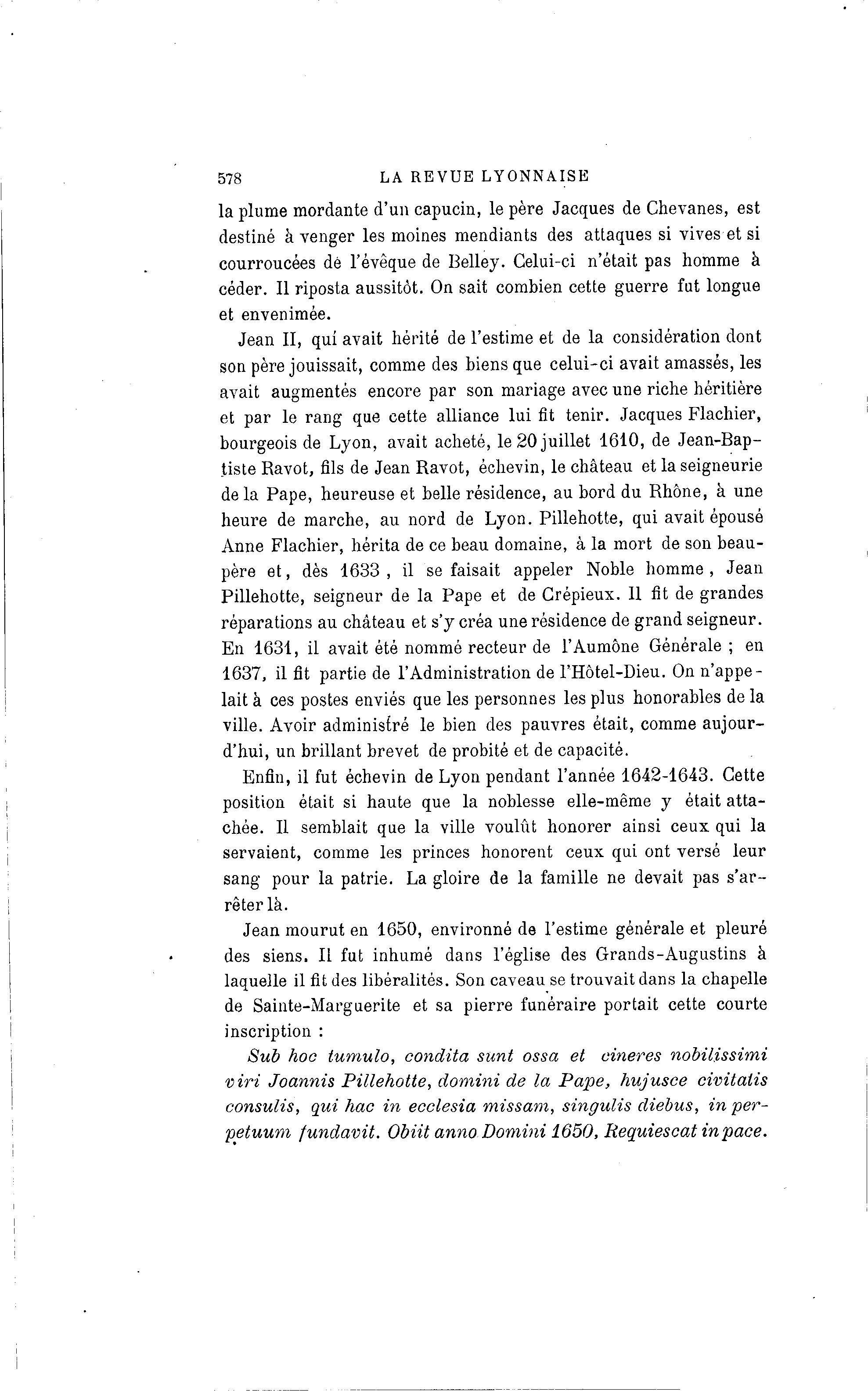 578 LA REVUE LYONNAISE la plume mordante d'un capucin, le père Jacques de Chevanes, est destiné à venger les moines mendiants des attaques si vives et si courroucées dé l'évêque de Belley. Celui-ci n'était pas homme à céder. Il riposta aussitôt. On sait combien cette guerre fut longue et envenimée. Jean II, qui avait hérité de l'estime et de la considération dont son père jouissait, comme des biens que celui-ci avait amassés, les avait augmentés encore par son mariage avec une riche héritière et par le rang que cette alliance lui fit tenir. Jacques Flachier, bourgeois de Lyon, avait acheté, le 20 juillet 1610, de Jean-Bap- tiste Ravot, fils de Jean Ravot, échevin, le château et la seigneurie delà Pape, heureuse et belle résidence, au bord du Rhône, à une heure de marche, au nord de Lyon. Pillehotte, qui avait épousé Anne Flachier, hérita de ce beau domaine, à la mort de son beau- père et, dès 1633 , il se faisait appeler Noble homme , Jean Pillehotte, seigneur de la Pape et de Grépieux. Il fit de grandes réparations au château et s'y créa une résidence de grand seigneur. En 1631, il avait été nommé recteur de l'Aumône Générale ; en 1637, il fit partie de l'Administration de l'Hôtel-Dieu. On n'appe- lait à ces postes enviés que les personnes les plus honorables de la ville. Avoir administré le bien des pauvres était, comme aujour- d'hui, un brillant brevet de probité et de capacité. Enfin, il fut échevin de Lyon pendant l'année 1642-1643. Cette position était si haute que la noblesse elle-même y était atta- chée. Il semblait que la ville voulût honorer ainsi ceux qui la servaient, comme les princes honorent ceux qui ont versé leur sang pour la patrie. La gloire de la famille ne devait pas s'ar- rêter là . Jean mourut en 1650, environné de l'estime générale et pleuré des siens. Il fut inhumé dans l'église des Grands-Augustins à laquelle il fit des libéralités. Son caveau se trouvait dans la chapelle de Sainte-Marguerite et sa pierre funéraire portait cette courte inscription : Suà hoc tumulo, condita sunt ossa et cineres nobilissimi viri Joannis Pillehotte, domini de la Pape, hujusce civitatis consulis, qui hac in ecclesia missam, singulis diebus, in per- petuum fundavit. Obiit anno Domini 1650, Requiescat inpace.