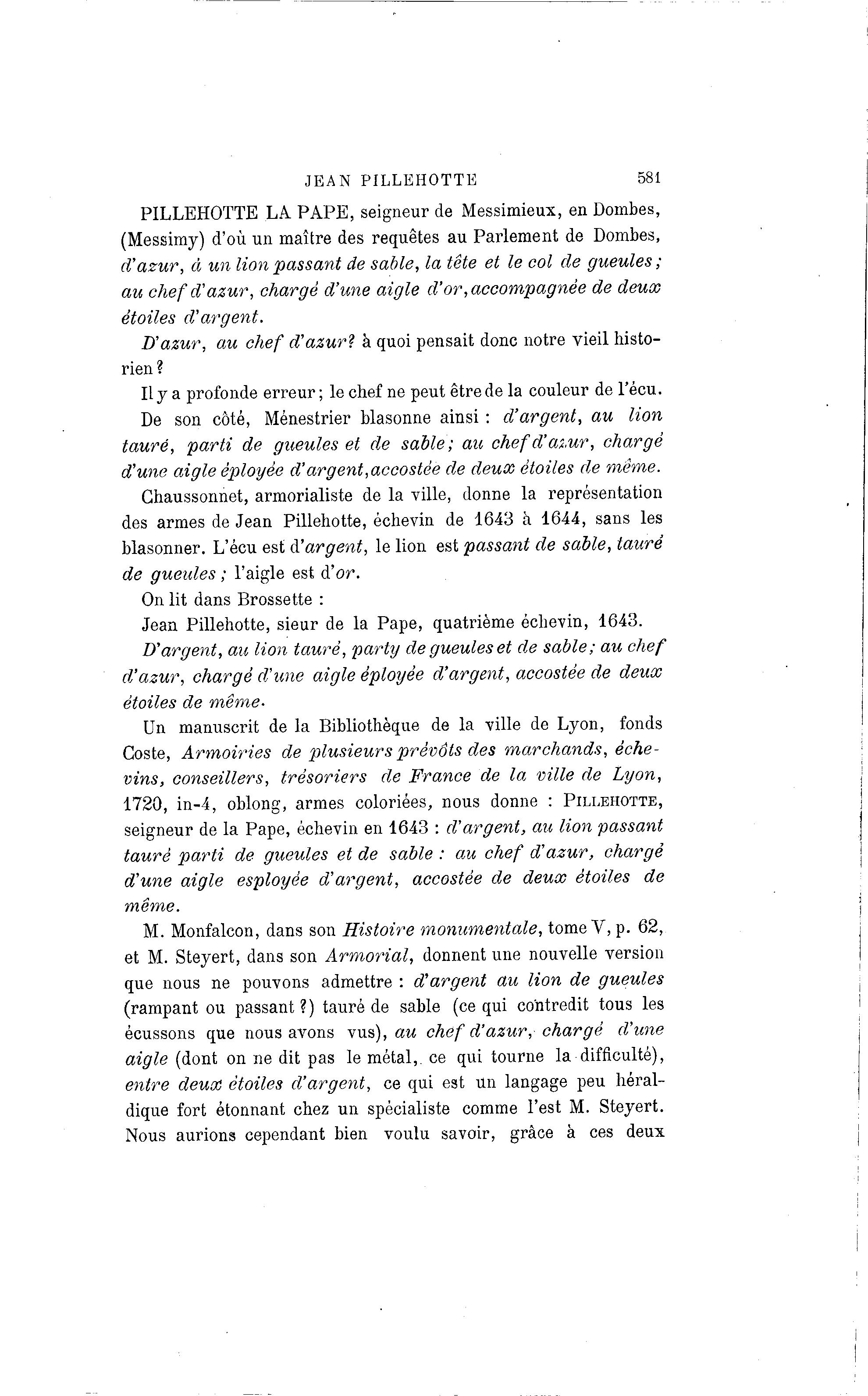 PILLEHOTTE LA PAPE, seigneur de Messimieux, en Dombes,