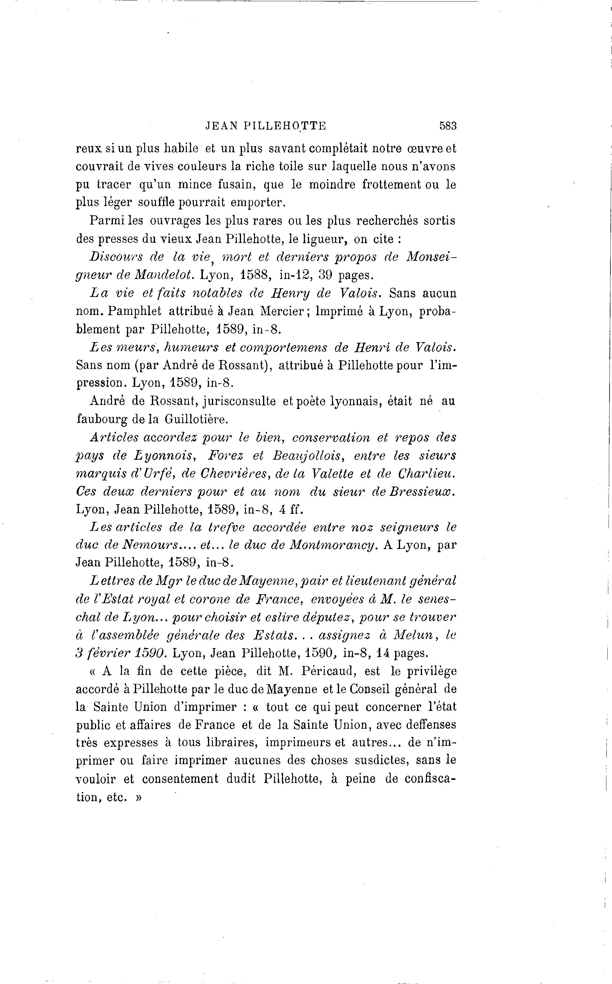 JEAN P I L L E H O T T E 583 reux si un plus habile et un plus savant complétait notre œuvre et couvrait de vives couleurs la riche toile sur laquelle nous n'avons pu tracer qu'un mince fusain, que le moindre frottement ou le plus léger souffle pourrait emporter. Parmi les ouvrages les plus rares ou les plus recherchés sortis des presses du vieux Jean Pillehotte, le ligueur, on cite : Discours de la vie mort et derniers propos de Monsei- gneur de Mandelot. Lyon, 1588, in-12, 39 pages. La vie et faits notables de Henry de Valois. Sans aucun nom. Pamphlet attribué à Jean Mercier; Imprimé à Lyon, proba- blement par Pillehotte, 1589, in-8. Les meurs, humeurs et comporlemens de Henri de Valois. Sans nom (par André de Rossant), attribué à Pillehotte pour l'im- pression. Lyon, 1589, in-8. André de Rossant, jurisconsulte et poète lyonnais, était né au faubourg de la Guillotière. Articles accordez pour le bien, conservation et repos des pays de Lyonnois, Forez et Beaujollois, entre les sieurs marquis d'Urfé, de Chevrières, de la Valette et de Charlieu. Ces deux derniers pour et au nom du sieur de Bressieuoc. Lyon, Jean Pillehotte, 1589, in-8, 4 ff. Les articles de la trefve accordée entre noz seigneurs le duc de Nemours et... le duc de Montmorancy. A Lyon, par Jean Pillehotte, 1589, in-8. Lettres de Mgr le duc de Mayenne, pair et lieutenant général de TEstât royal et corone de France, envoyées à M. le senes- chal de Lyon... pour choisir et eslire députez, pour se trouver à l'assemblée générale des Estais. . . assignez à Melun, le 3 février 1590. Lyon, Jean Pillehotte, 1590, in-8, 14 pages. « A la fin de cette pièce, dit M. Péricaud, est le privilège accordé à Pillehotte par le duc de Mayenne et le Conseil général de la Sainte Union d'imprimer : « tout ce qui peut concerner l'état public et affaires de France et de la Sainte Union, avec deffenses très expresses à tous libraires, imprimeurs et autres... de n'im- primer ou faire imprimer aucunes des choses susdictes, sans le vouloir et consentement dudit Pillehotte, à peine de confisca- tion, etc. »