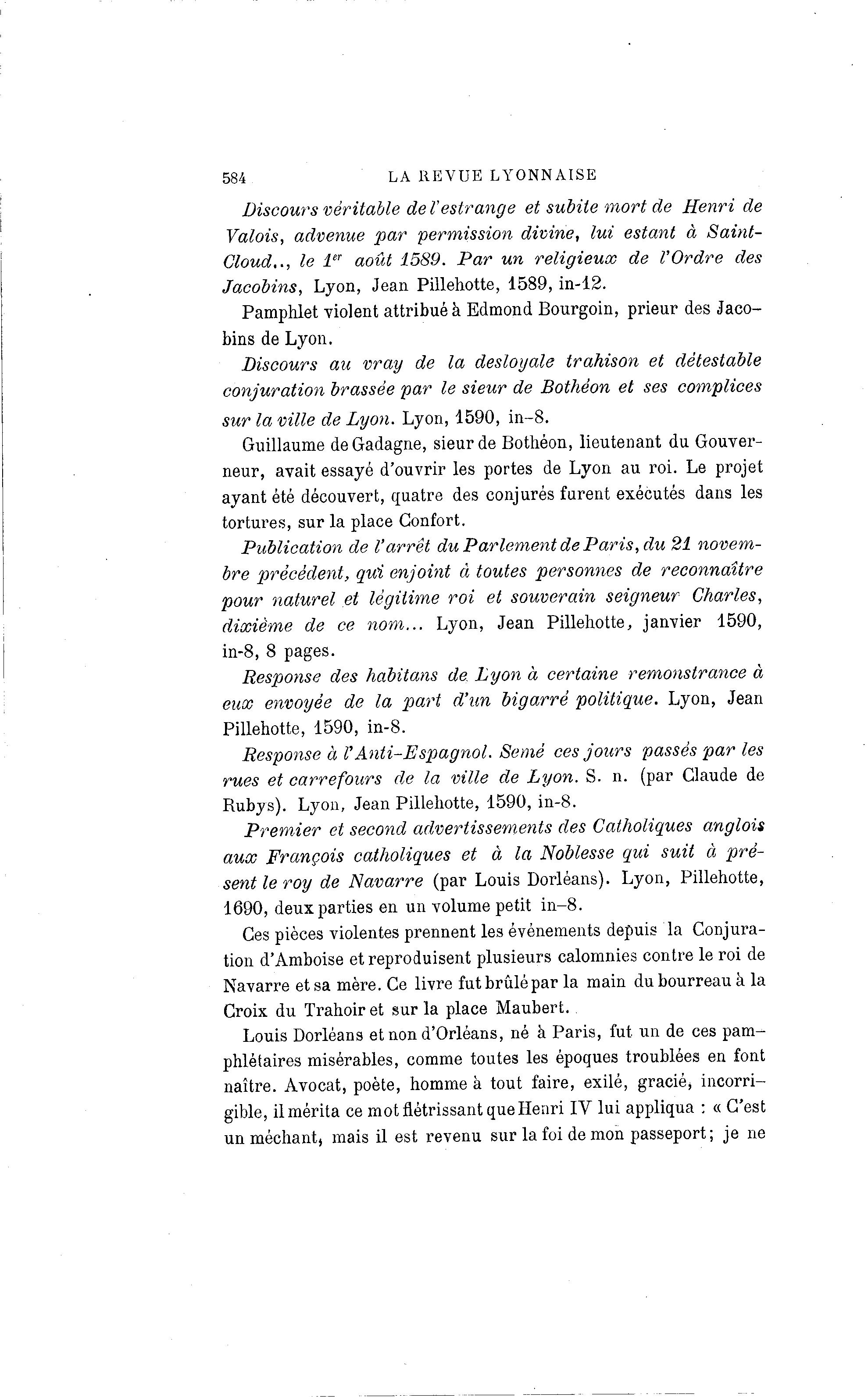 sur la ville de Lyon. Lyon, 1590, in-8.