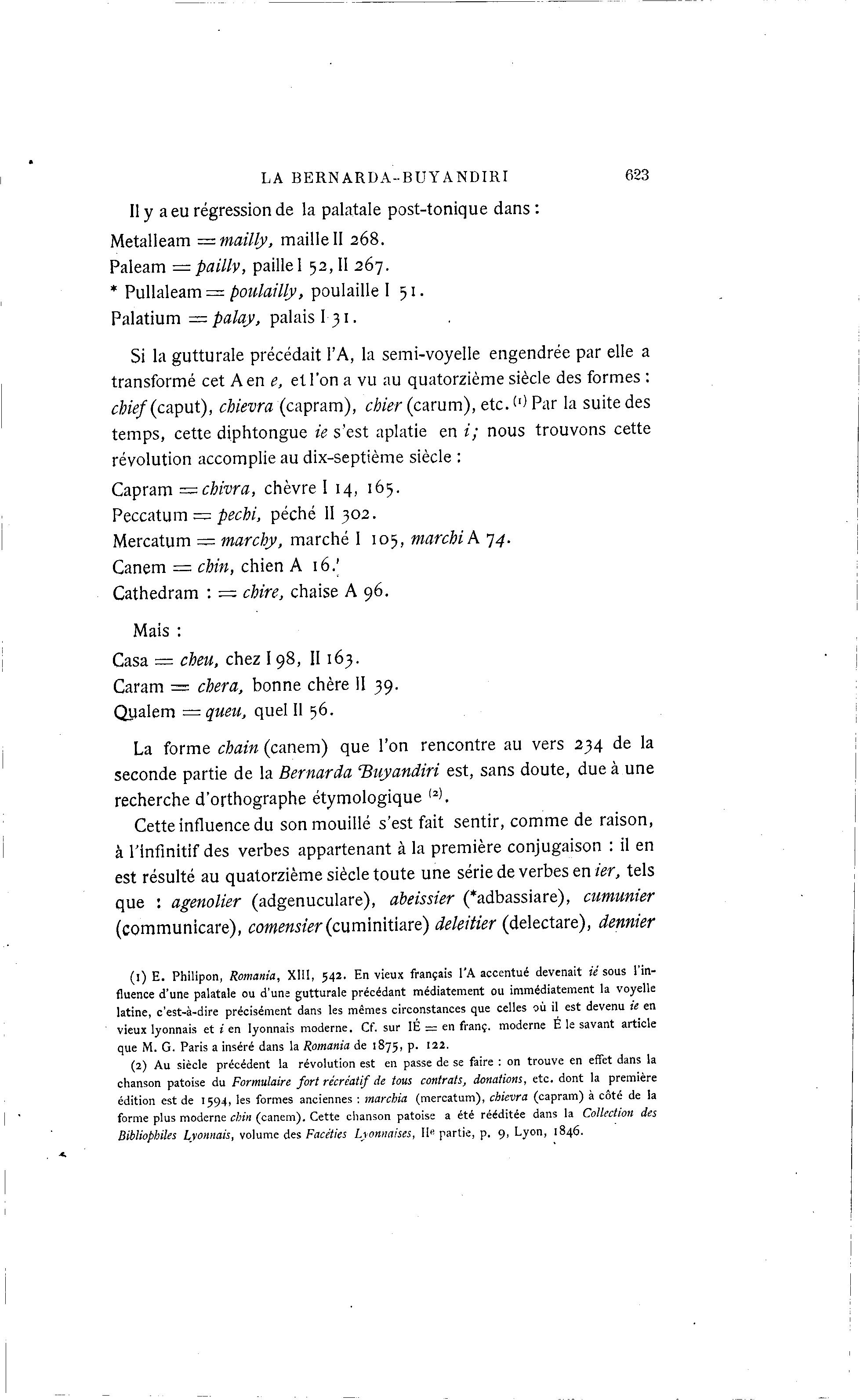 LA BERNARDA-BUYANDIRI 623 Il y a eu régression de la palatale post-tonique dans : Metalleam = mailly, maille II 268. Paleam — pailly, paille 1 52,11 267. * Pullaleam = poulailly, poulaille I 51. Palatium — palay, palais I 31. Si la gutturale précédait l'A, la semi-voyelle engendrée par elle a transformé cet A en e, et l'on a vu au quatorzième siècle des formes : cfe/(caput), chievra (capram), chier (carum), etc.(I) Par la suite des temps, cette diphtongue ie s'est aplatie en i; nous trouvons cette révolution accomplie au dix-septième siècle : Capram = chivra, chèvre I 14, 165. Peccatum = pechi, péché II 302. Mercatum = marchy, marché I 105, marcMA 74. Canem = chin, chien A 16/ Cathedram : = chire, chaise A 96. Mais : Casa = cheu, chez 198, II163. Caram = cher a, bonne chère II 39. Qyalem =queu, quel II 56. La forme cbain (canem) que l'on rencontre au vers 234 de la seconde partie de la Bernarda Tiuyandiri est, sans doute, due à une recherche d'orthographe étymologique <2). Cette influence du son mouillé s'est fait sentir, comme de raison, à l'infinitif des verbes appartenant à la première conjugaison : il en est résulté au quatorzième siècle toute une série de verbes en ier, tels que : agenolier (adgenuculare), abeissier (*adbassiare), cumunier (communicare), comensier (cuminitiare) deleitier (delectare), dennier (1) E. Philipon, Romania, XIII, 542. En vieux français l'A accentué devenait ié sous l'in- fluence d'une palatale ou d'une gutturale précédant médiatement ou immédiatement la voyelle latine, c'est-à -dire précisément dans les mêmes circonstances que celles où il est devenu ie en vieux lyonnais et i en lyonnais moderne. Cf. sur IE = en franc, moderne E le savant article que M. G. Paris a inséré dans la Romania de 1875, p. 122. (2) Au siècle précédent la révolution est en passe de se faire : on trouve en effet dans la chanson patoise du Formulaire fort récréatif de tous contrats, donations, etc. dont la première édition est de 1594, les formes anciennes : marchia (mercatum), chievra (capram) à côté de !a forme plus moderne chin (canem). Cette chanson patoise a été rééditée dans la Collection des Bibliophiles Lyonnais, volume des Facéties Lyonnaises, Impartie, p. 9, Lyon, 1846.