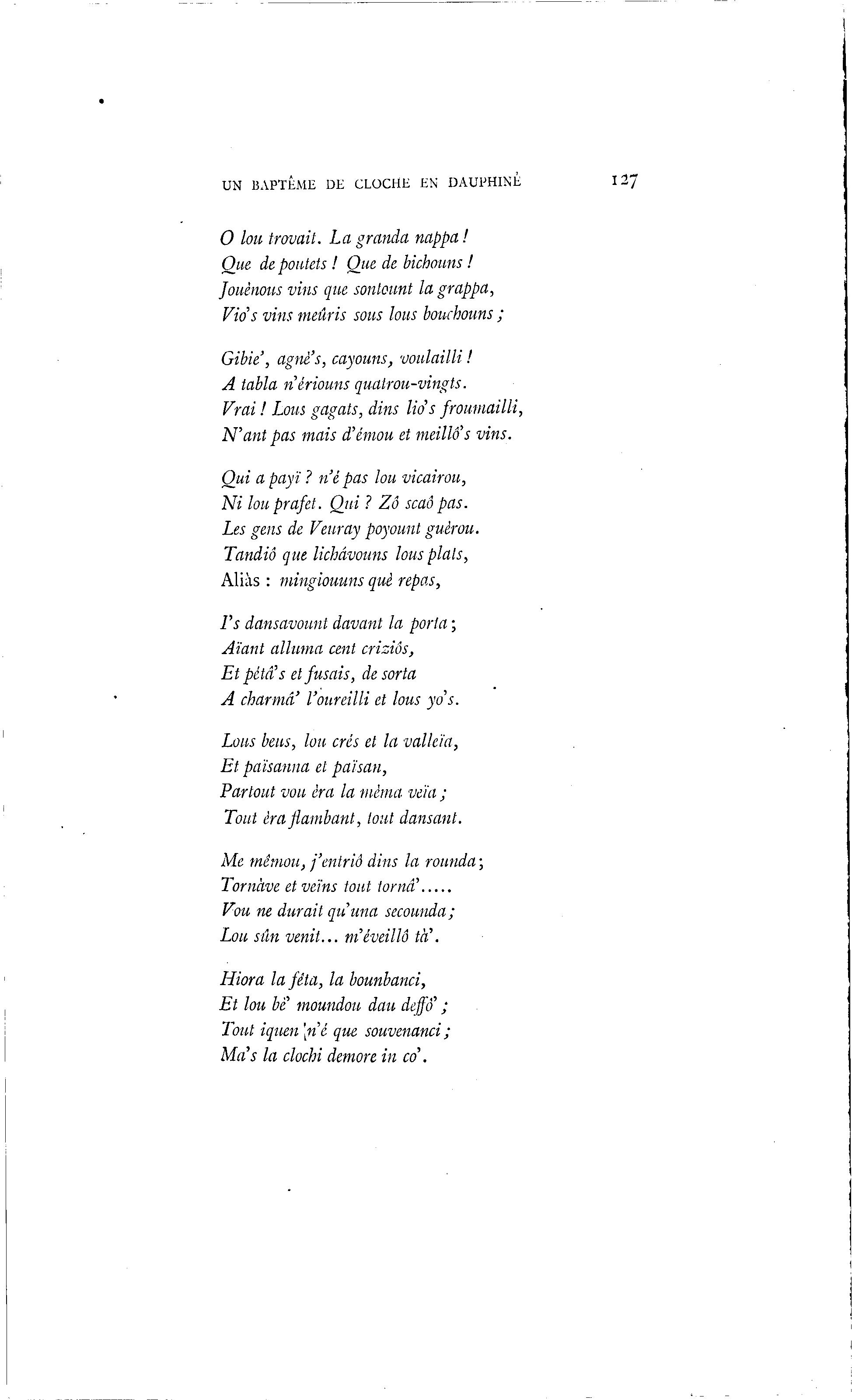 UN BAPTÊME DE CLOCHE EN DAUPHINE 127 0 lou travail. La granda nappa ! Que de pontets ! Que de bichouns ! Jouènous vins que sontount la grappa, Vids vins meûris sous lous bouchouns ; Gibie', agnè's, cayouns, voidailli ! A tabla n'ériouns quatrou-vingts. Vrai ! Lous gagats, dins lids froumailli, N'ant pas mais d'émou et meillô's vins. Qui apayï? né pas lou vicairou, Ni lou prafet. Oui ? Zô scaô pas. Les gens de Veuray poyount guèrou. Tandiô que lichâvouns lous plais, Aliàs : mingiouuns que repas, F s dansavount davant la porta ; Aïant alluma cent criziôs, Et pétâ's et fusais, desorta A charma' l'oureilli et lous yds. Lous beus, lou crés et la valleïa, Et païsanna et paisan, "Partout vou ira la mèma veïa ; Tout ira flambant, tout dansant. Me mêmou, j'entriô dins la rounda ; Tornà ve etveins tout iornâ' Vou ne durait quuna secounda; Lou sûn venit... m'éveilla ta'. Hiora la fêta, la bounbanci, Et lou be moundou dau deffô' ; Tout iquen [n'é que souvenanci ; Ma's la clochi demore in cd.