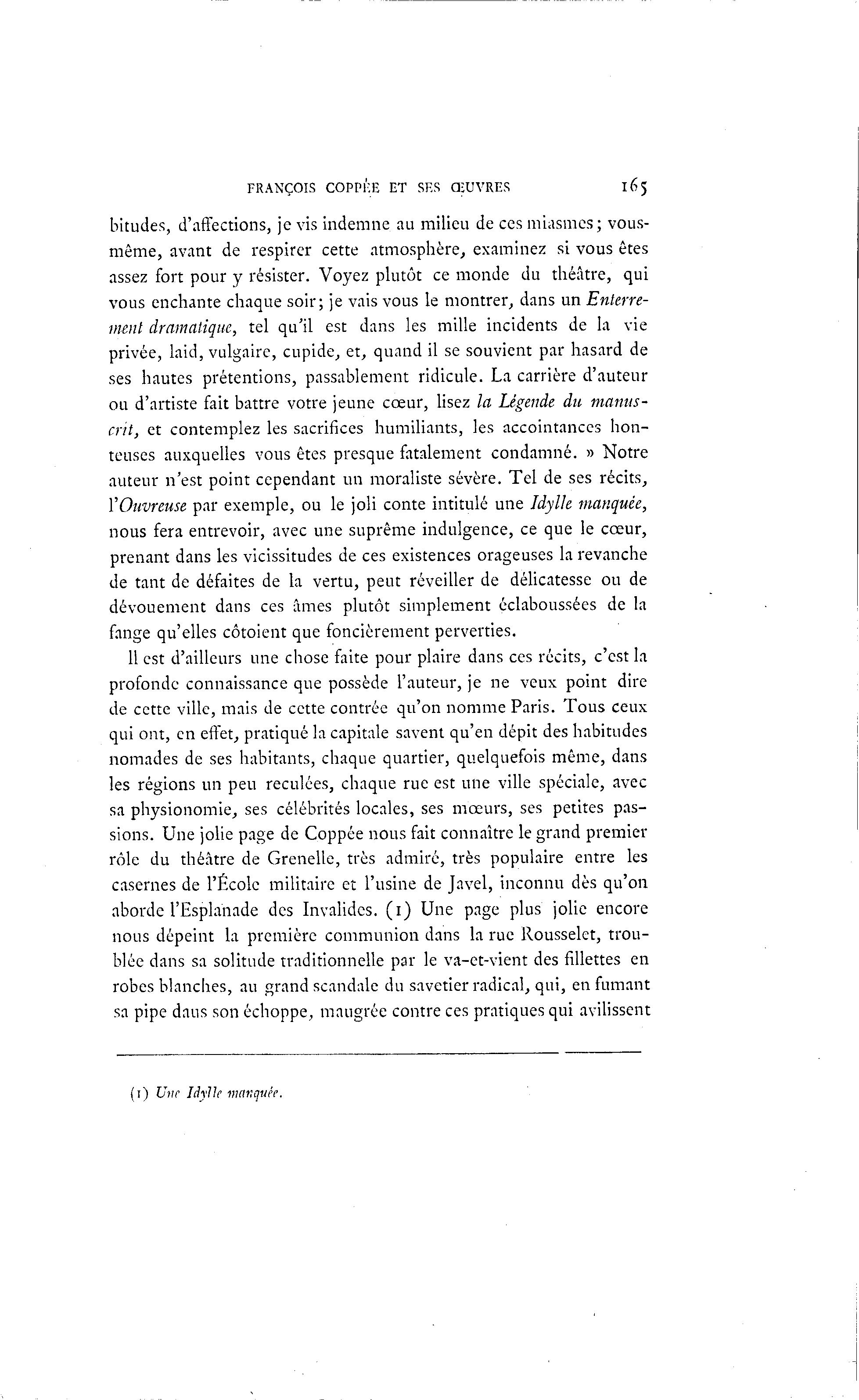 FRANÇOIS COPPF.E ET SES ŒUVRES 165 bitudes, d'affections, je vis indemne au milieu de ces miasmes; vous- même, avant de respirer cette atmosphère, examinez si vous êtes assez fort pour y résister. Voyez plutôt ce monde du théâtre, qui vous enchante chaque soir; je vais vous le montrer, dans un Enterre- ment dramatique, tel qu'il est dans les mille incidents de la vie privée, laid, vulgaire, cupide, et, quand il se souvient par hasard de ses hautes prétentions, passablement ridicule. La carrière d'auteur ou d'artiste fait battre votre jeune cœur, lisez la Légende du manus- crit, et contemplez les sacrifices humiliants, les accointances hon- teuses auxquelles vous êtes presque fatalement condamné. » Notre auteur n'est point cependant un moraliste sévère. Tel de ses récits, l'Ouvreuse par exemple, ou le joli conte intitulé une Idylle manquée, nous fera entrevoir, avec une suprême indulgence, ce que le cœur, prenant dans les vicissitudes de ces existences orageuses la revanche de tant de défaites de la vertu, peut réveiller de délicatesse ou de dévouement dans ces âmes plutôt simplement éclaboussées de la fange qu'elles côtoient que foncièrement perverties. 11 est d'ailleurs une chose faite pour plaire dans ces récits, c'est la profonde connaissance que possède l'auteur, je ne veux point dire de cette ville, mais de cette contrée qu'on nomme Paris. Tous ceux qui ont, en effet, pratiqué la capitale savent qu'en dépit des habitudes nomades de ses habitants, chaque quartier, quelquefois même, dans les régions un peu reculées, chaque rue est une ville spéciale, avec sa physionomie, ses célébrités locales, ses mœurs, ses petites pas- sions. Une jolie page de Coppée nous fait connaître le grand premier rôle du théâtre de Grenelle, très admiré, très populaire entre les casernes de l'Ecole militaire et l'usine de Javel, inconnu dès qu'on aborde l'Esplanade des Invalides, ( i ) Une page plus jolie encore nous dépeint la première communion dans la rue Rousselet, trou- blée dans sa solitude traditionnelle par le va-et-vient des fillettes en robes blanches, au grand scandale du savetier radical, qui, en fumant sa pipe dans son échoppe, maugrée contre ces pratiques qui avilissent (1) Une Idylle manquée.