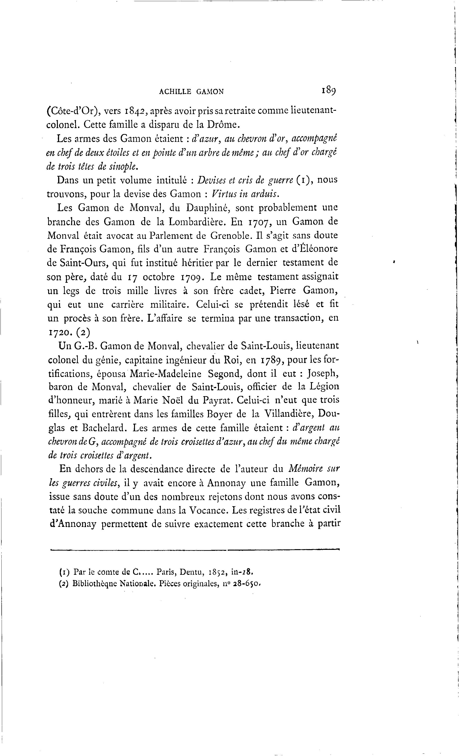 Les Gamon de Monval, du Dauphiné, sont probablement une