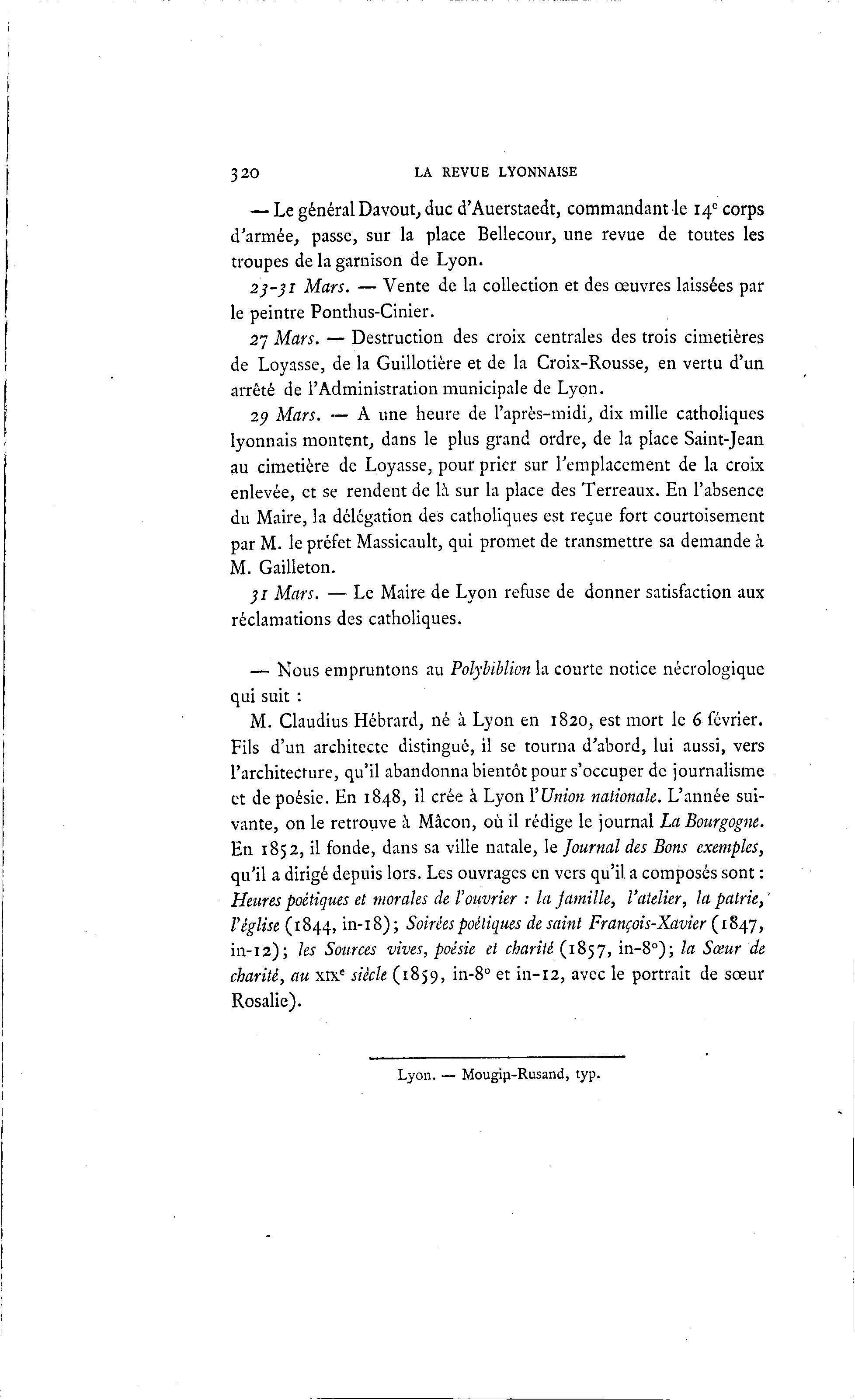 M. Claudius Hébrard, né à Lyon en 1820, est mort le 6 février.
