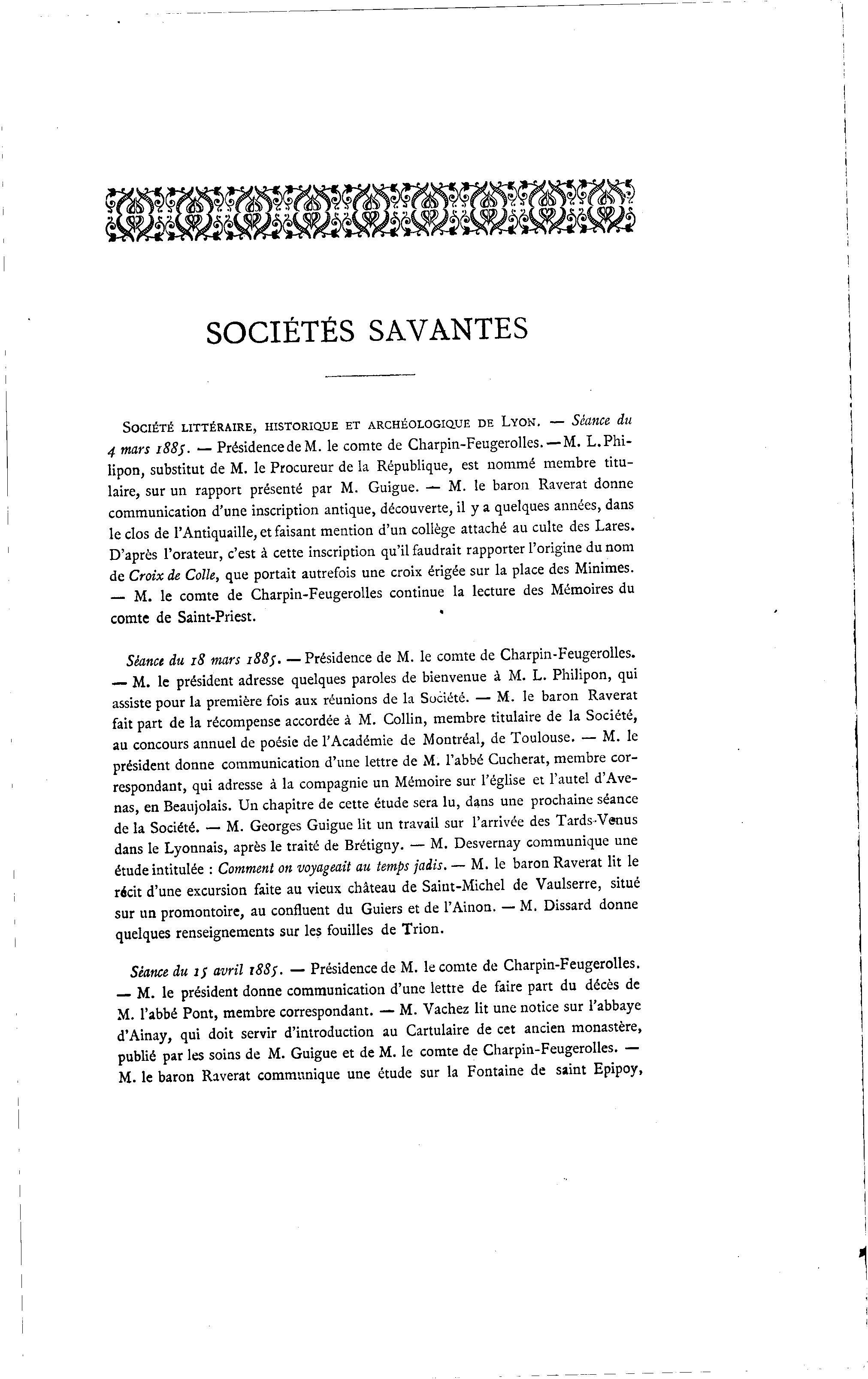 SOCIÉTÉS SAVANTES SOCIÉTÉ LITTÉRAIRE, HISTORIQUE ET ARCHÉOLOGIQUE DE LYON. — Séance du 4 mars 1885. — Présidence de M. le comte de Charpin-Feugerolles. — M. L.Phi- lipon, substitut de M. le Procureur de la République, est nommé membre titu- laire, sur un rapport présenté par M. Guigue. — M. le baron Raverat donne communication d'une inscription antique, découverte, il y a quelques années, dans le clos de l'Antiquaille, et faisant mention d'un collège attaché au culte des Lares. D'après l'orateur, c'est à cette inscription qu'il faudrait rapporter l'origine du nom de Croix de Colle, que portait autrefois une croix érigée sur la place des Minimes. — M. le comte de Charpin-Feugerolles continue la lecture des Mémoires du comte de Saint-Priest. « Séance du 18 mars 188s. — Présidence de M. le comte de Charpin-Feugerolles. — M. le président adresse quelques paroles de bienvenue à M. L. Philipon, qui assiste pour la première fois aux réunions de la Société. — M. le baron Raverat fait part de la récompense accordée à M. Collin, membre titulaire de la Société, au concours annuel de poésie de l'Académie de Montréal, de Toulouse. — M. le président donne communication d'une lettre de M. l'abbé Cucherat, membre cor- respondant, qui adresse à la compagnie un Mémoire sur l'église et l'autel d'Ave- nas, en Beaujolais. Un chapitre de cette étude sera lu, dans une prochaine séance de la Société. — M. Georges Guigue lit un travail sur l'arrivée des Tards-Venus dans le Lyonnais, après le traité de Brétigny. — M. Desvernay communique une étude intitulée : Comment on voyageait au temps jadis. — M. le baron Raverat lit le récit d'une excursion faite au vieux château de Saint-Michel de Vaulserre, situé sur un promontoire, au confluent du Guiers et de l'Ainon. — M. Dissard donne quelques renseignements sur les fouilles de Trion. Séance du 1$ avril 1885. — Présidence de M. le comte de Charpin-Feugerolles. — M. le président donne communication d'une lettre de faire part du décès de M. l'abbé Pont, membre correspondant. — M. Vachez lit une notice sur l'abbaye d'Ainay, qui doit servir d'introduction au Cartulaire de cet ancien monastère, publié par les soins de M. Guigue et de M. le comte de Charpin-Feugerolles. — M. le baron Raverat communique une étude sur la Fontaine de saint Epipoy,
