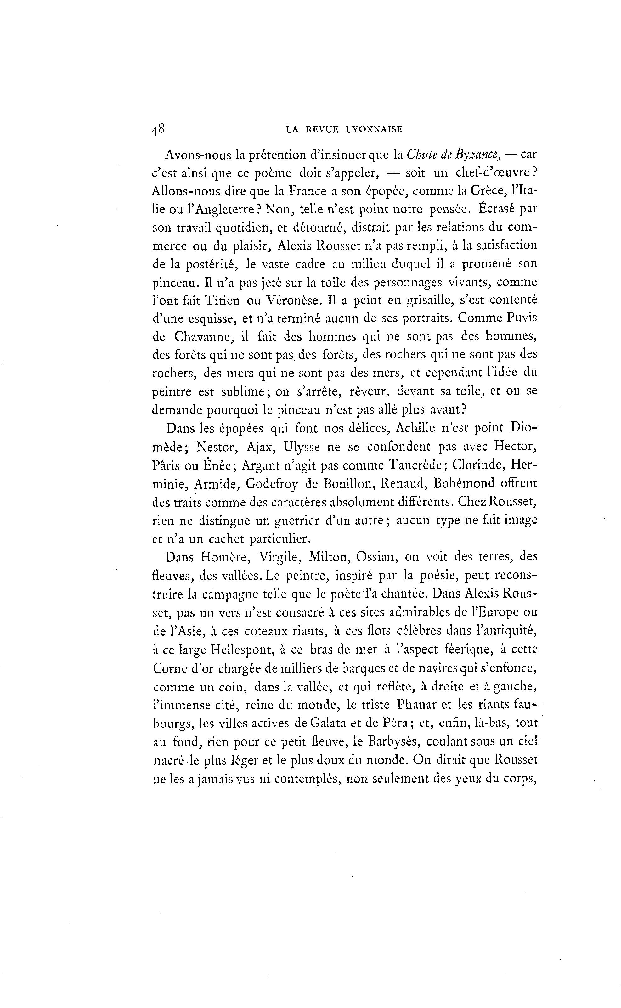 48 LA REVUE LYONNAISE Avons-nous la prétention d'insinuer que la Chute de Byzanee, — car c'est ainsi que ce poème doit s'appeler, •— soit un chef-d'œuvre? Allons-nous dire que la France a son épopée, comme la Grèce, l'Ita- lie ou l'Angleterre? Non, telle n'est point notre pensée. Écrasé par son travail quotidien, et détourné, distrait par les relations du com- merce ou du plaisir, Alexis Rousset n'a pas rempli, à la satisfaction de la postérité, le vaste cadre au milieu duquel il a promené son pinceau. Il n'a pas jeté sur la toile des personnages vivants, comme l'ont fait Titien ou Véronèse. Il a peint en grisaille, s'est contenté d'une esquisse, et n'a terminé aucun de ses portraits. Comme Puvis de Chavanne, il fait des hommes qui ne sont pas des hommes, des forêts qui ne sont pas des forêts, des rochers qui ne sont pas des rochers, des mers qui ne sont pas des mers, et cependant l'idée du peintre est sublime ; on s'arrête, rêveur, devant sa toile, et on se demande pourquoi le pinceau n'est pas allé plus avant? Dans les épopées qui font nos délices, Achille n'est point Dio- mède; Nestor, Ajax, Ulysse ne se confondent pas avec Hector, Paris ou Enée; Argant n'agit pas comme Tancrède; Clorinde, Her- minie, Armide, Godefroy de Bouillon, Renaud, Bohémond offrent des traits comme des caractères absolument différents. Chez Rousset, rien ne distingue un guerrier d'un autre ; aucun type ne fait image et n'a un cachet particulier. Dans Homère, Virgile, Milton, Ossian, on voit des terres, des fleuves, des vallées. Le peintre, inspiré par la poésie, peut recons- truire la campagne telle que le poète l'a chantée. Dans Alexis Rous- set, pas un vers n'est consacré à ces sites admirables de l'Europe ou de l'Asie, à ces coteaux riants, à ces flots célèbres dans l'antiquité, à ce large Hellespont, à ce bras de mer à l'aspect féerique, à cette Corne d'or chargée de milliers de barques et de navires qui s'enfonce, comme un coin, dans la vallée, et qui reflète, à droite et à gauche, l'immense cité, reine du monde, le triste Phanar et les riants fau- bourgs, les villes actives deGalata et de Péra; et, enfin, là -bas, tout au fond, rien pour ce petit fleuve, le Barbysès, coulant sous un ciel nacré le plus léger et le plus doux du monde. On dirait que Rousset ne les a jamais vus ni contemplés, non seulement des yeux du corps,