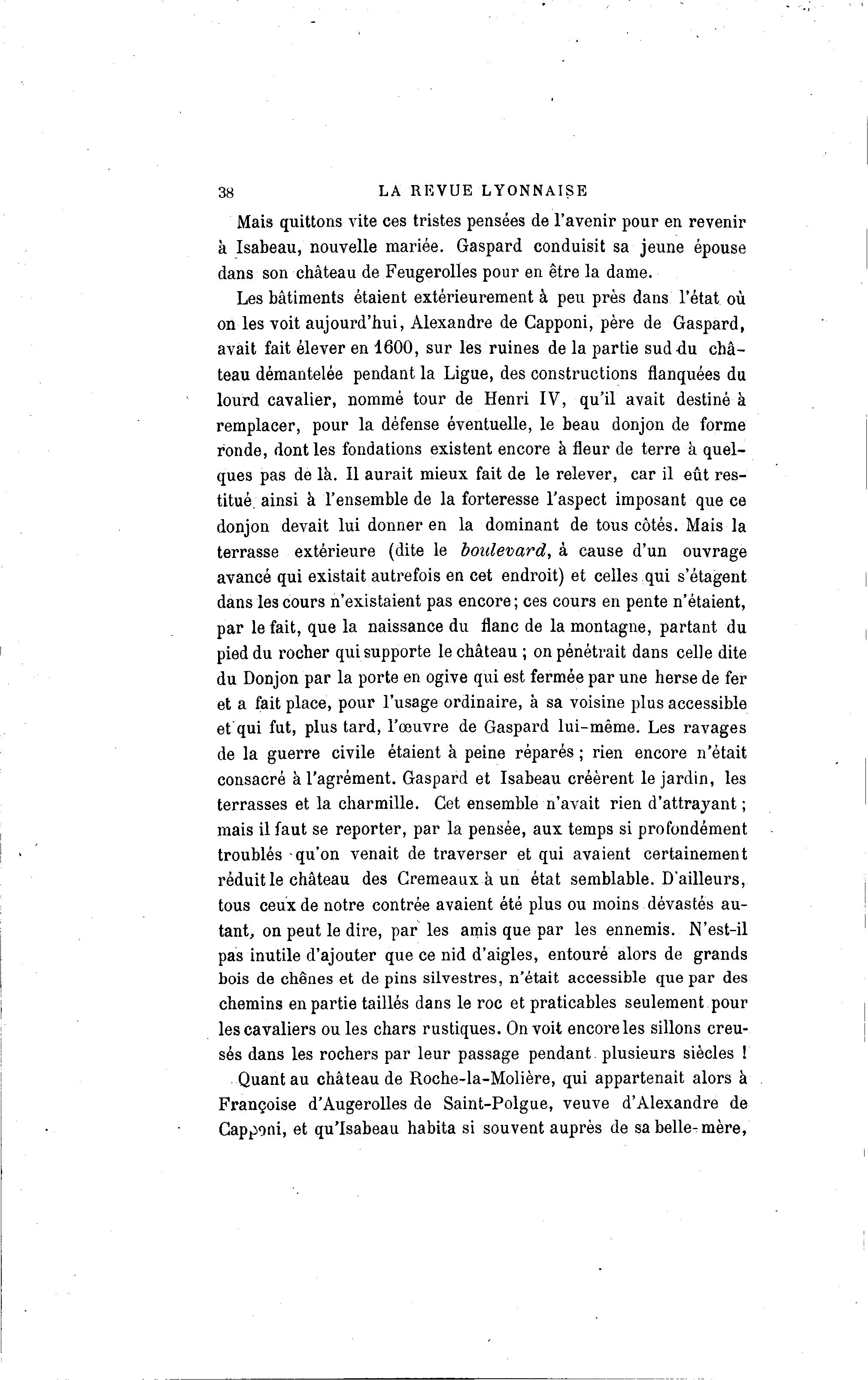 38 LA REVUE LYONNAISE Mais quittons vite ces tristes pensées de l'avenir pour en revenir à Isabeau, nouvelle mariée. Gaspard conduisit sa jeune épouse dans son château de Feugerolles pour en être la dame. Les bâtiments étaient extérieurement à peu près dans l'état où on les voit aujourd'hui, Alexandre de Capponi, père de Gaspard, avait fait élever en 1600, sur les ruines de la partie sud du châ- teau démantelée pendant la Ligue, des constructions flanquées du lourd cavalier, nommé tour de Henri IV, qu'il avait destiné à remplacer, pour la défense éventuelle, le beau donjon de forme ronde, dont les fondations existent encore à fleur de terre à quel- ques pas de là . Il aurait mieux fait de le relever, car il eût res- titué, ainsi à l'ensemble de la forteresse l'aspect imposant que ce donjon devait lui donner en la dominant de tous côtés. Mais la terrasse extérieure (dite le boulevard, à cause d'un ouvrage avancé qui existait autrefois en cet endroit) et celles qui s'étagent dans les cours n'existaient pas encore ; ces cours en pente n'étaient, par le fait, que la naissance du flanc de la montagne, partant du pied du rocher qui supporte le château ; on pénétrait dans celle dite du Donjon par la porte en ogive qui est fermée par une herse de fer et a fait placé, pour l'usage ordinaire, à sa voisine plus accessible et qui fut, plus tard, l'œuvre de Gaspard lui-même. Les ravages de la guerre civile étaient à peine réparés ; rien encore n'était consacré à l'agrément. Gaspard et Isabeau créèrent le jardin, les terrasses et la charmille. Cet ensemble n'avait rien d'attrayant ; mais il faut se reporter, par la pensée, aux temps si profondément troublés -qu'on venait de traverser et qui avaient certainement réduit le château des Cremeaux à un état semblable. D'ailleurs, tous ceux de notre contrée avaient été plus ou moins dévastés au- tant, on peut le dire, par les amis que par les ennemis. N'est-il pas inutile d'ajouter que ce nid d'aigles, entouré alors de grands bois de chênes et de pins silvestres, n'était accessible que par des chemins en partie taillés dans le roc et praticables seulement pour les cavaliers ou les chars rustiques. On voit encore les sillons creu- sés dans les rochers par leur passage pendant plusieurs siècles ! Quant au château de Roche-la-Molière, qui appartenait alors à Françoise d'Augerolles de Saint-Polgue, veuve d'Alexandre de Capponi, et qu'Isabeau habita si souvent auprès de sa belle-mère,
